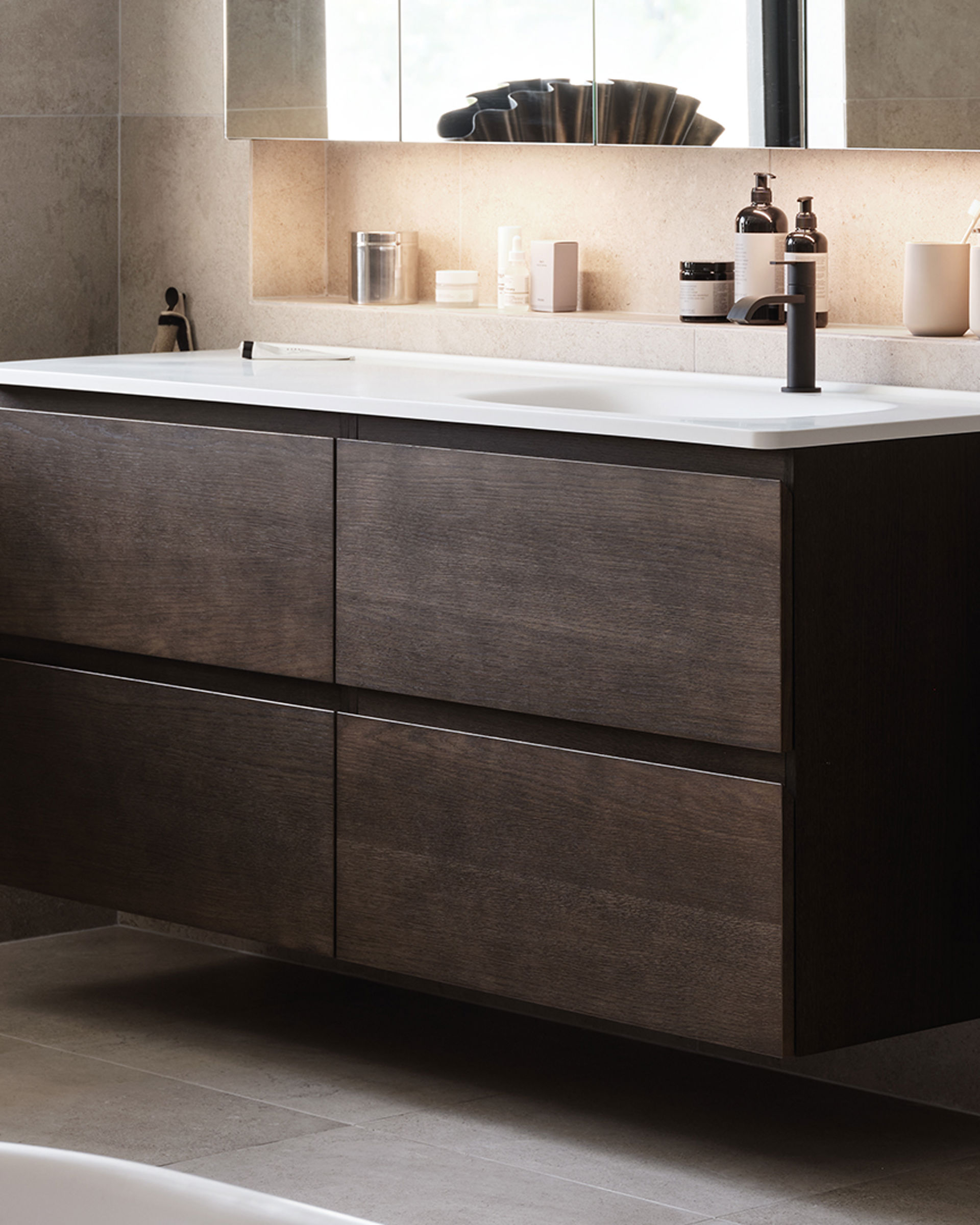 • Flow-serien er tilgjengelig i bredder på 500, 600, 750, 1000, 1200, 1500 og 2000 mm. Høyden og dybden på baderomsmøblene varierer avhengig av hvilken kommode og servant du velger. Du finner alle målene i katalogen vår.