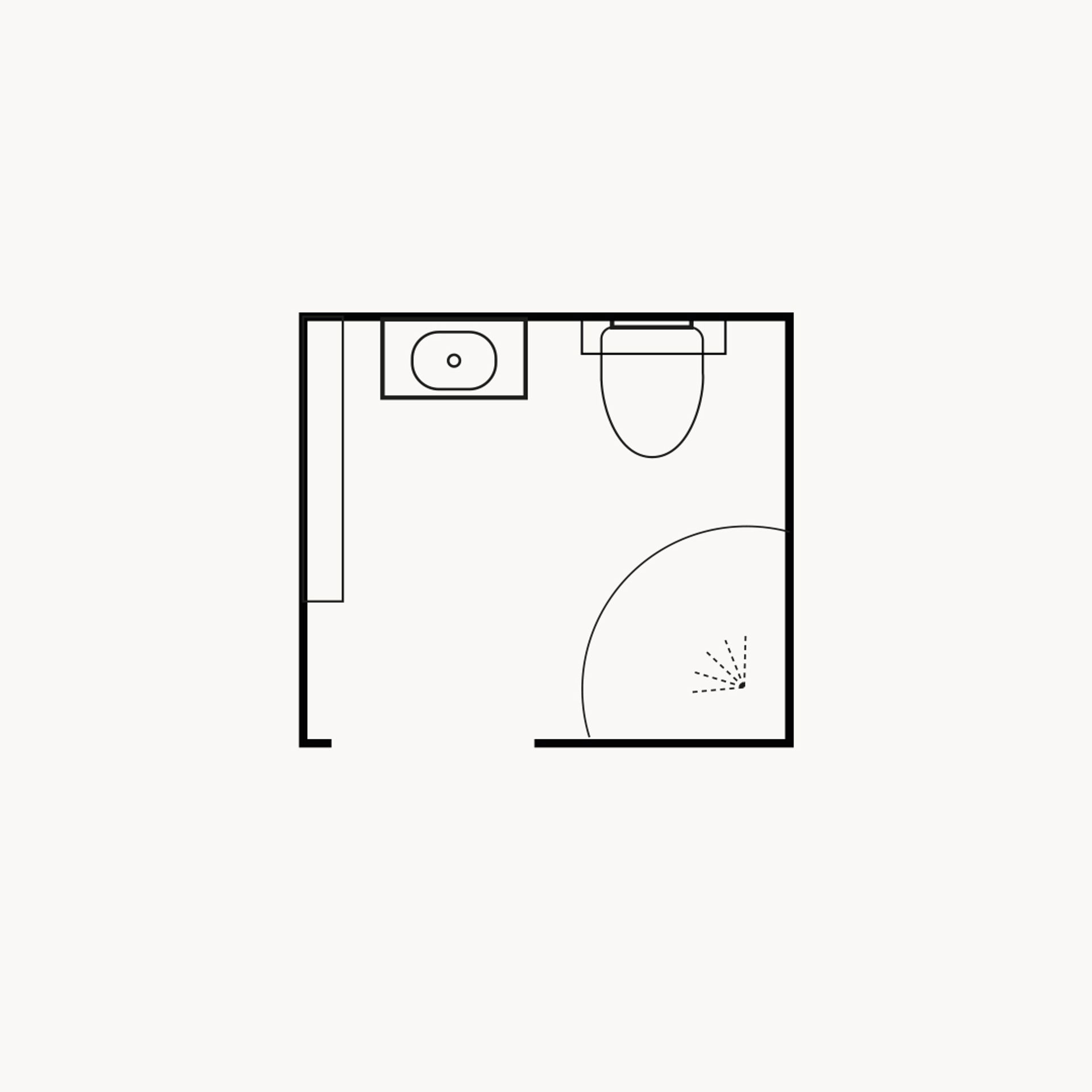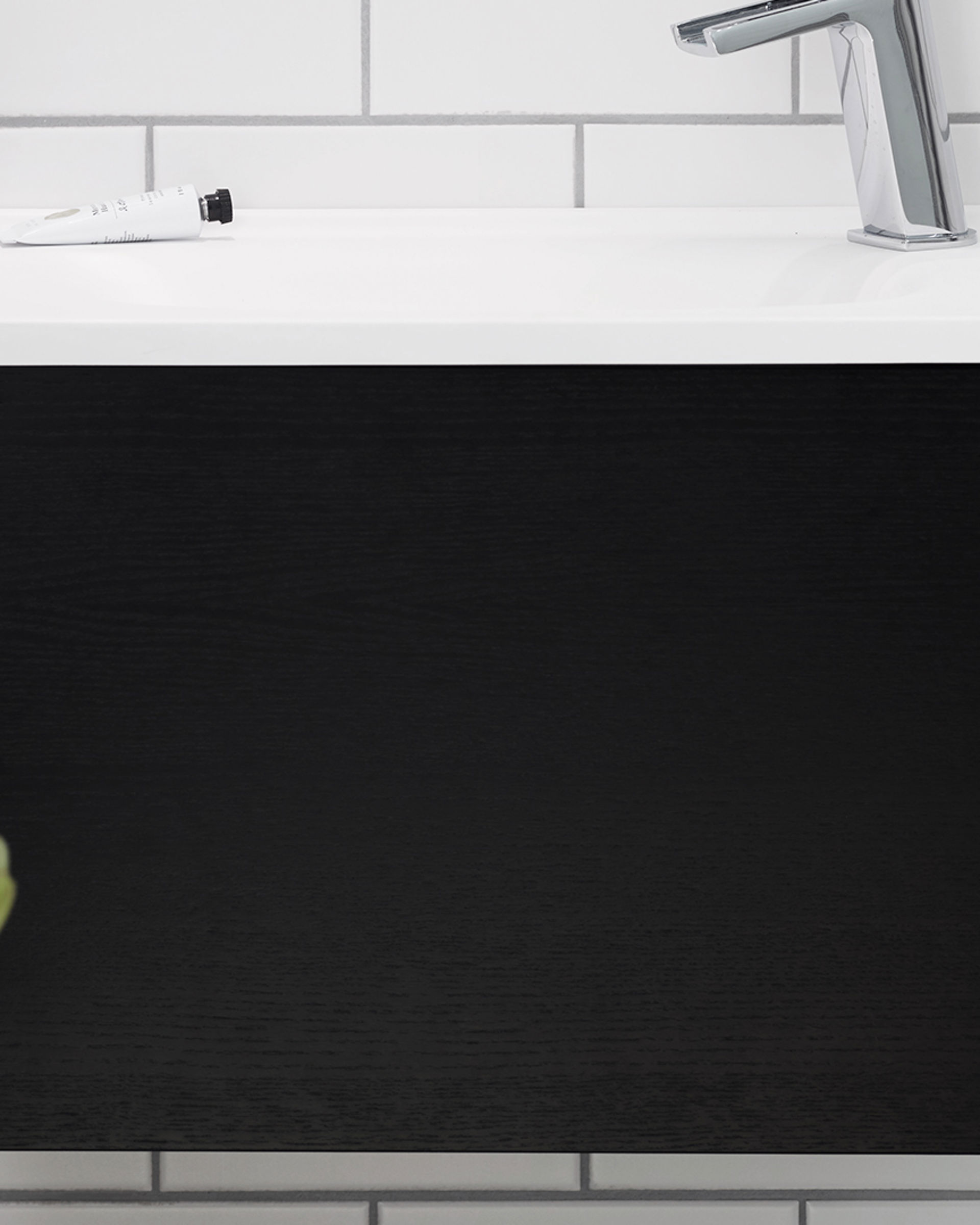 Flow i bredden 500 mm er kompakt, lett å plassere og derfor perfekt til mindre baderom. Her har vi laget et enkelt grafisk miljø i sort og hvitt med rene strippede linjer. Plassen utnyttes effektivt slik at alle funksjoner får plass til tross for den begrensede overflaten. Tidløst bølget mønster på gulvet gir liv til rommet.