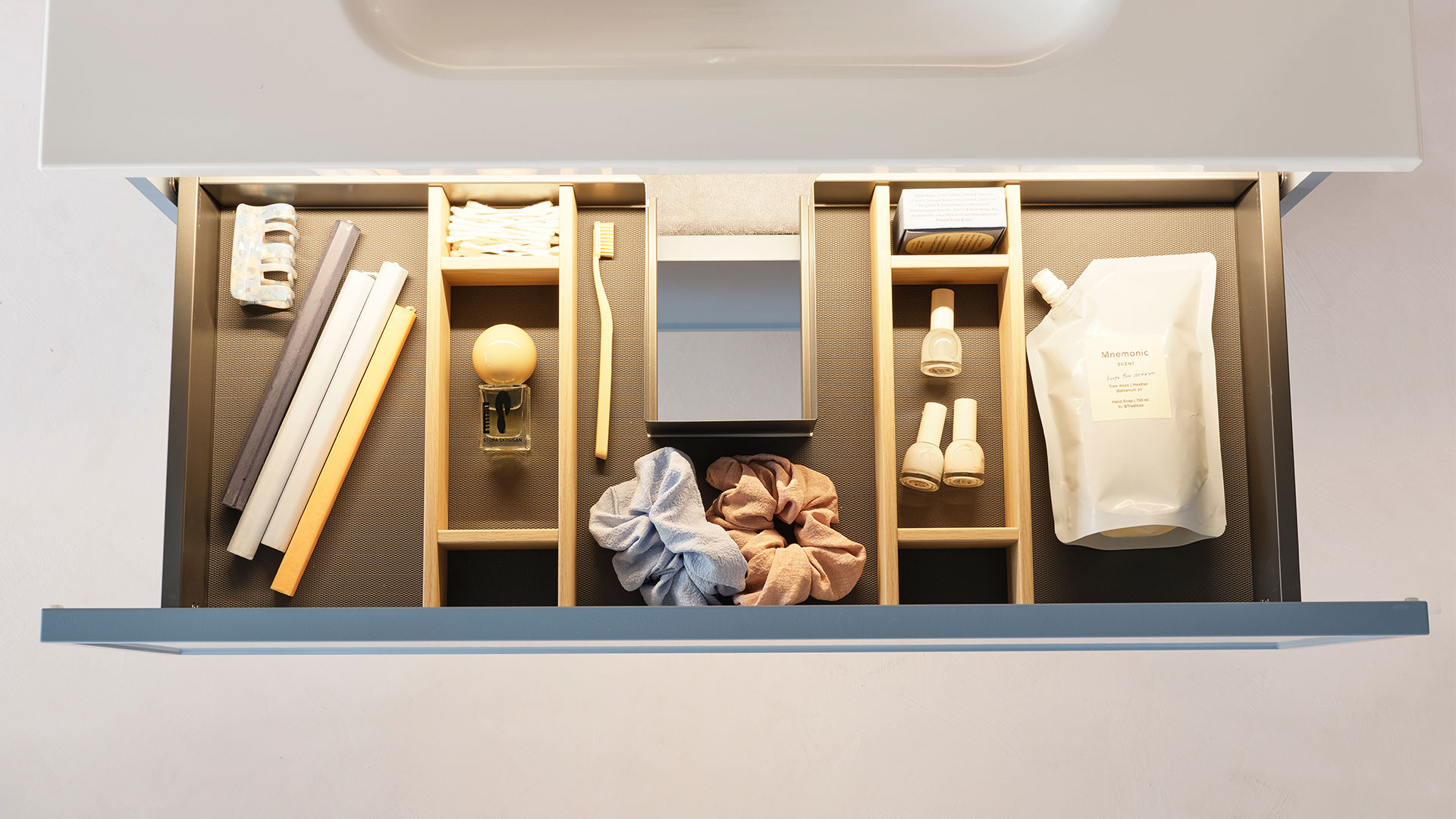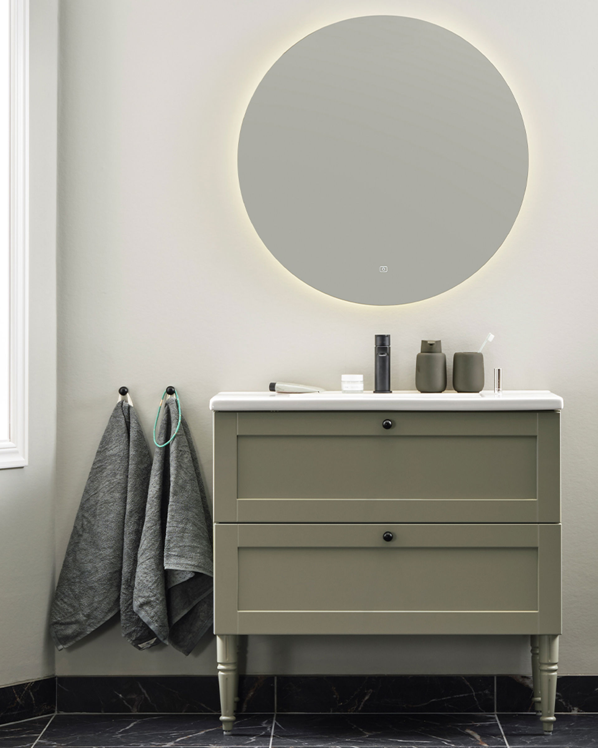 Rammedøren Edit brukes her i fargen tåkegrønn for å skape et klassisk bad med en følelse fra århundreskiftet. Det store, runde speilet Mjörn og det vakre oppbevaringsskapet på ben forsterker uttrykket. Et romslig og innbydende miljø med både harmonisk og luksuriøst utvalg av materialer og farger.