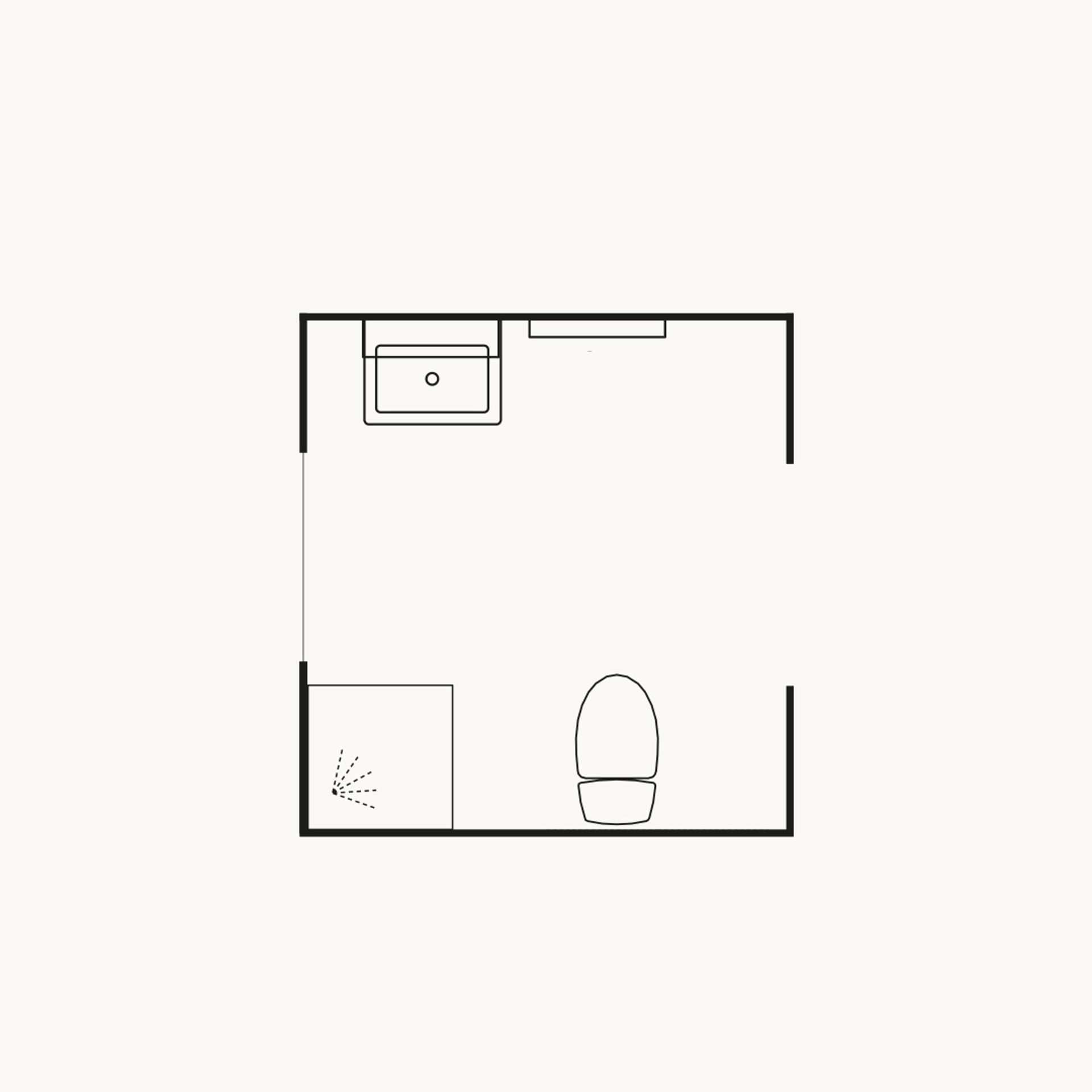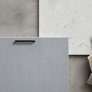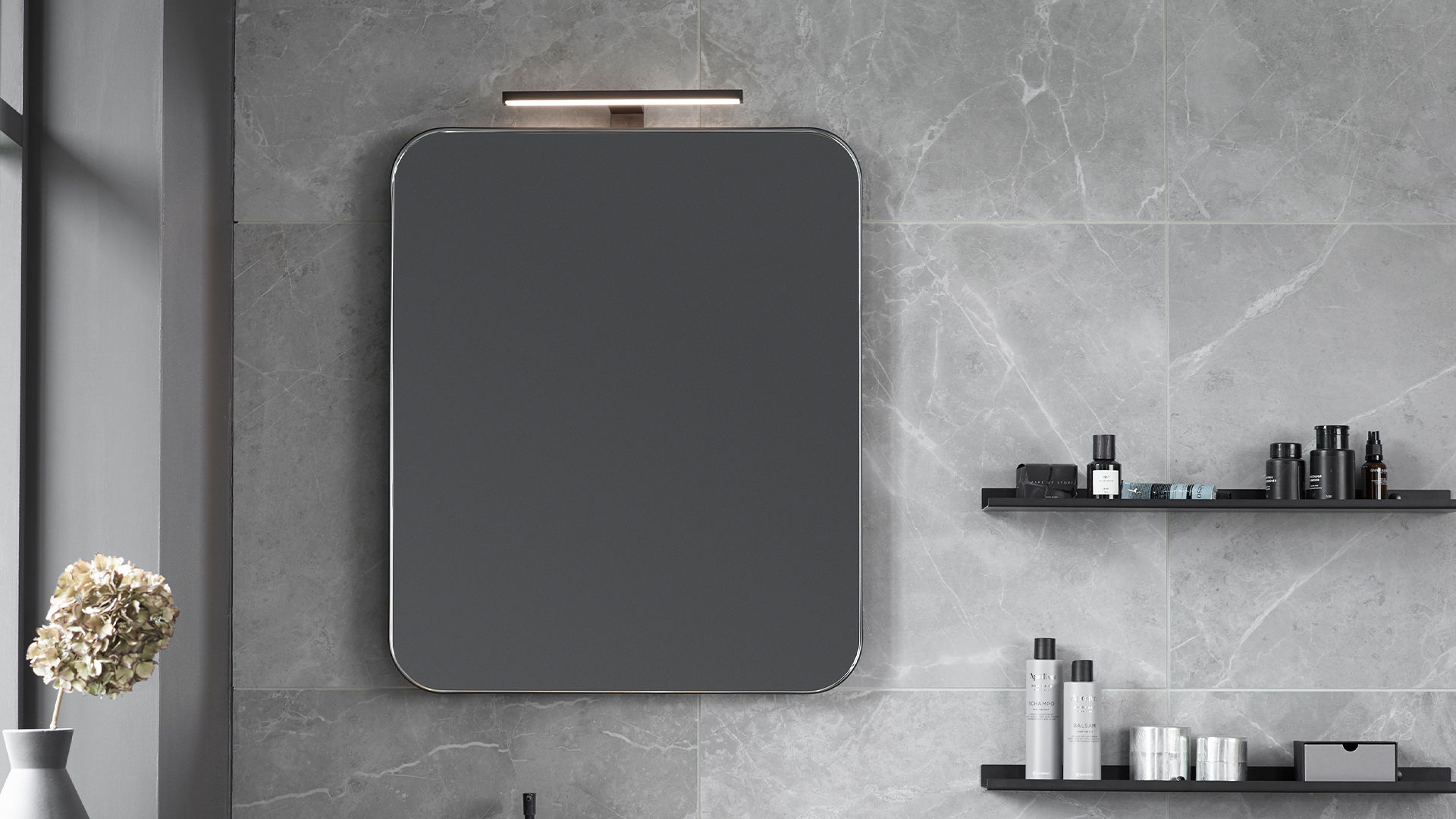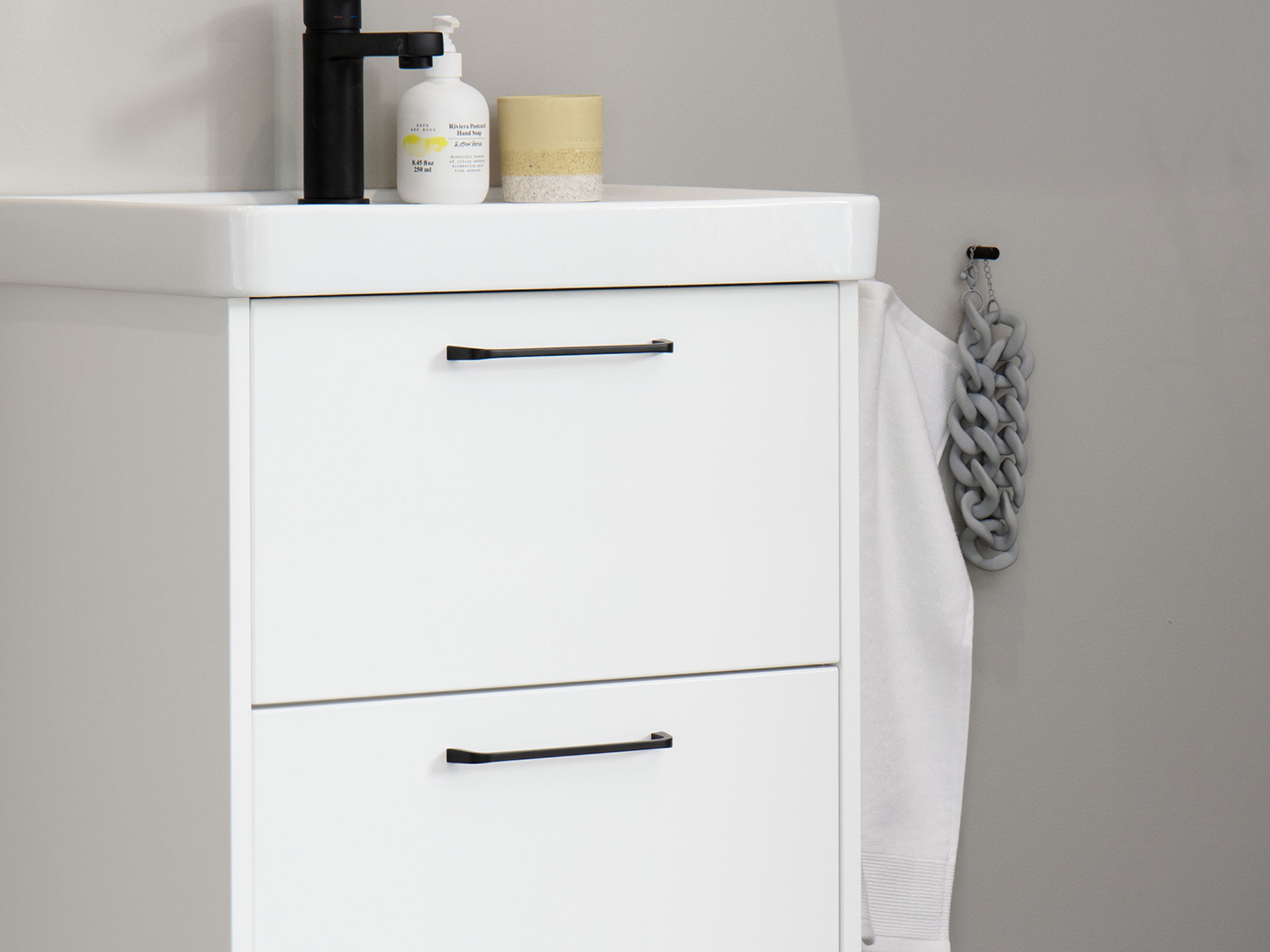Svanemerket dør i et baderom med moderne og samtidig tidløst utseende. Døren Nora har en taktil overflate med trestruktur som gir liv til rommet og skaper en fin kontrast til steinuttrykket i gulv og vegger. sorte hyller og knotter forsterker den gedigne følelsen.