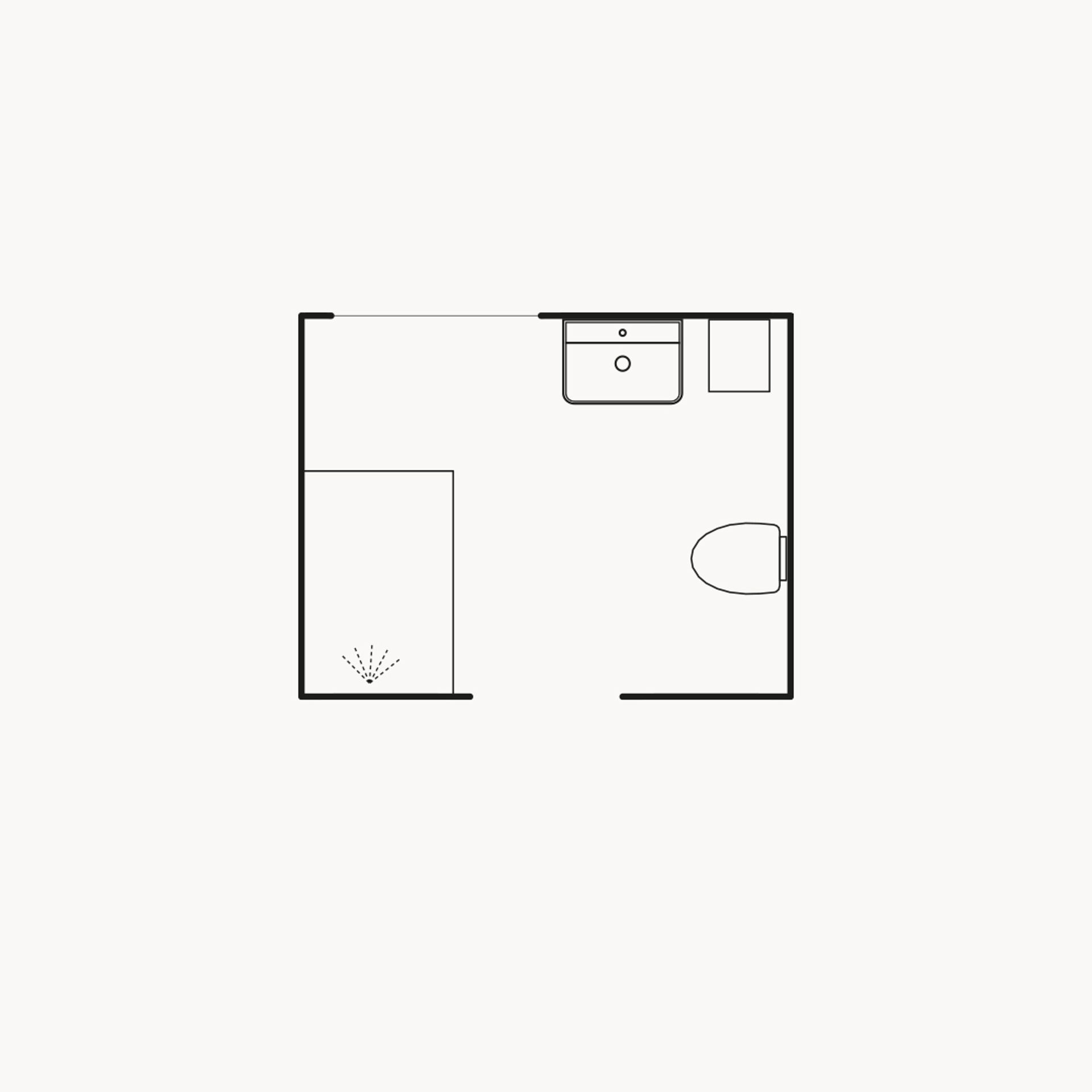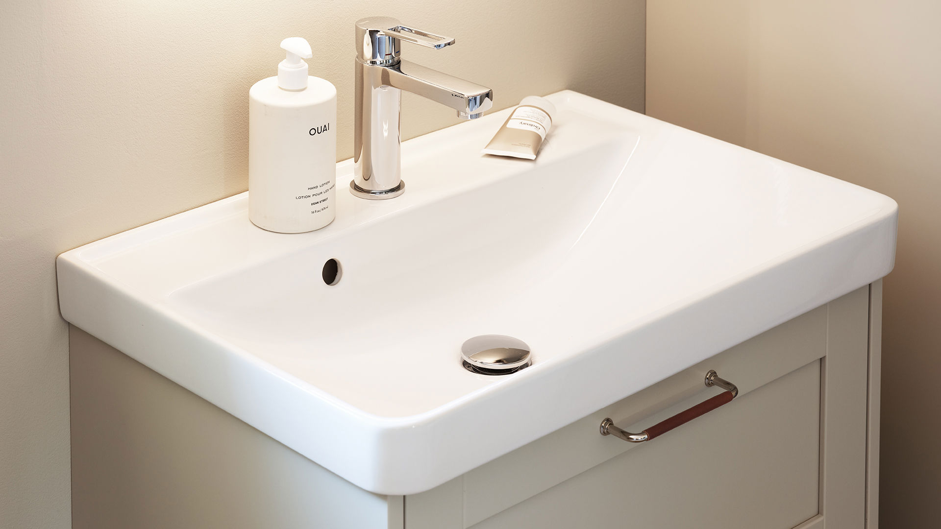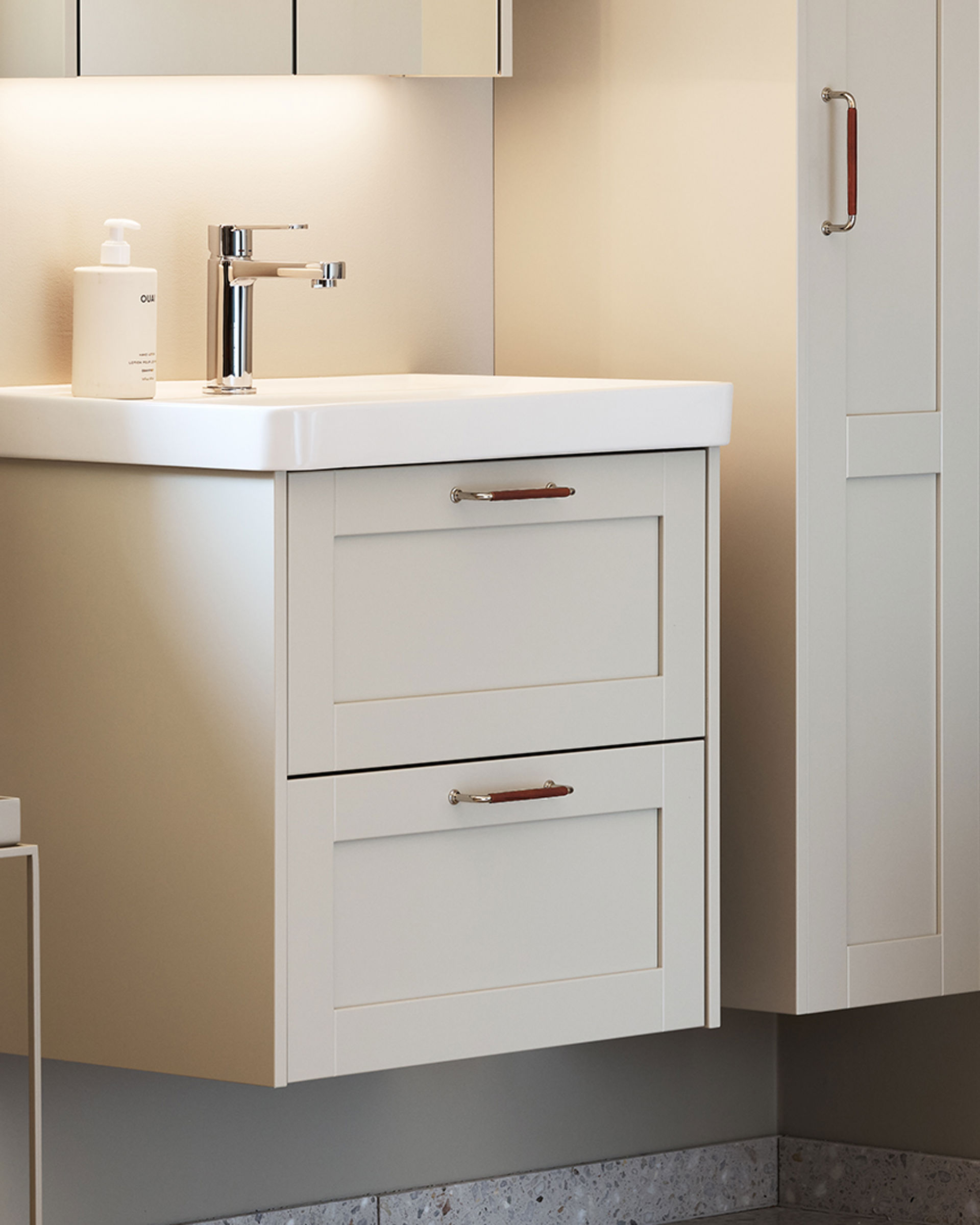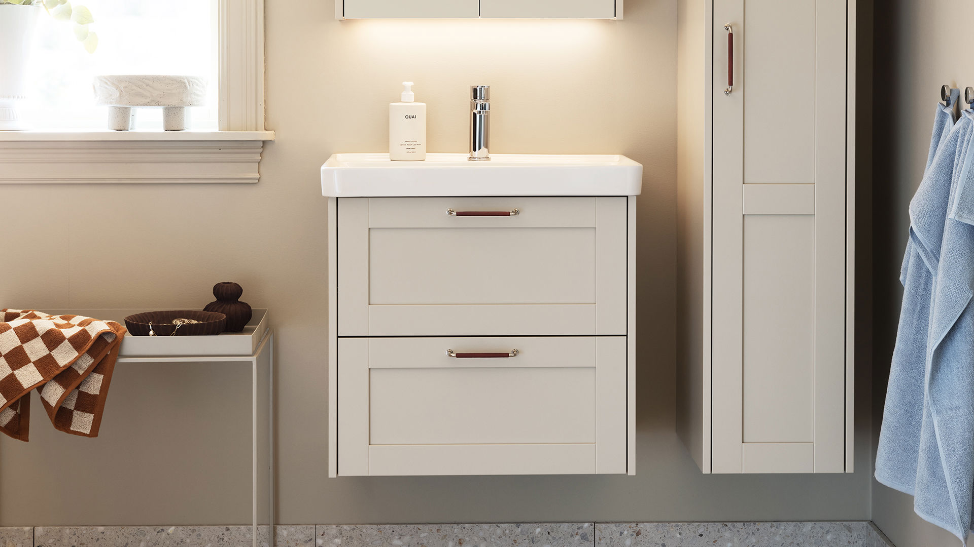 Moderne linjer med fine klassiske detaljer. På dette lille badet med myke toner har vår rammedør Edit fått et klassisk uttrykk i kombinasjon med innrammingen Frame og den stilrene servanten Mezzo. Speilskapet Ramsen rammes inn på samme måte som servantskapet, og sammen med skuffer i servantskapet og høyskapet skaper det maksimal oppbevaringsplass på et lite område.