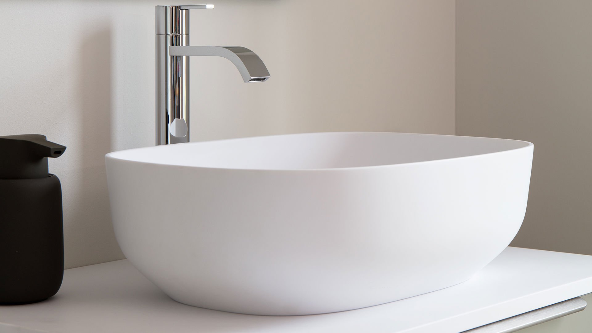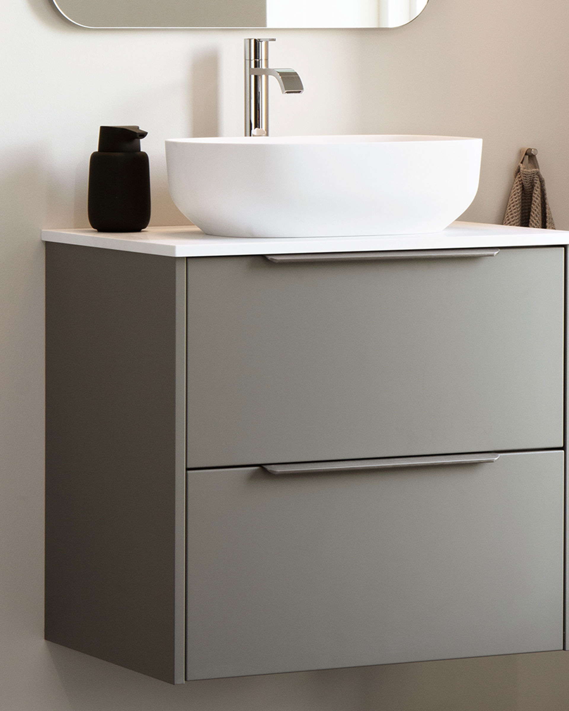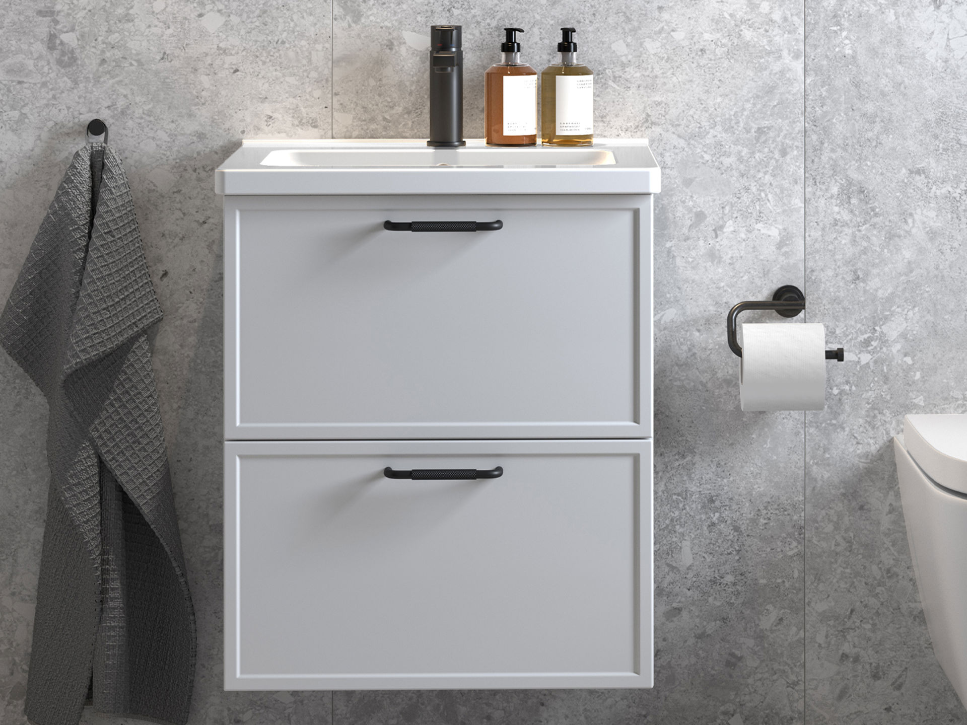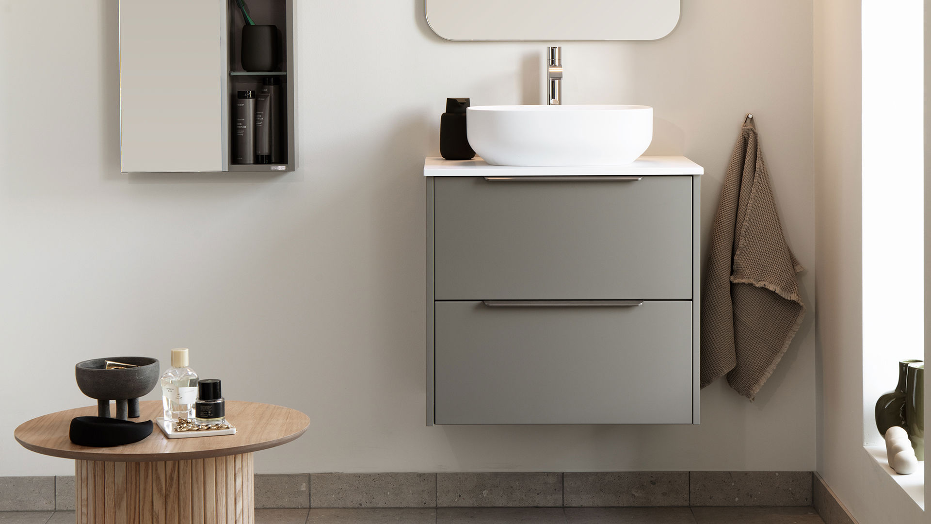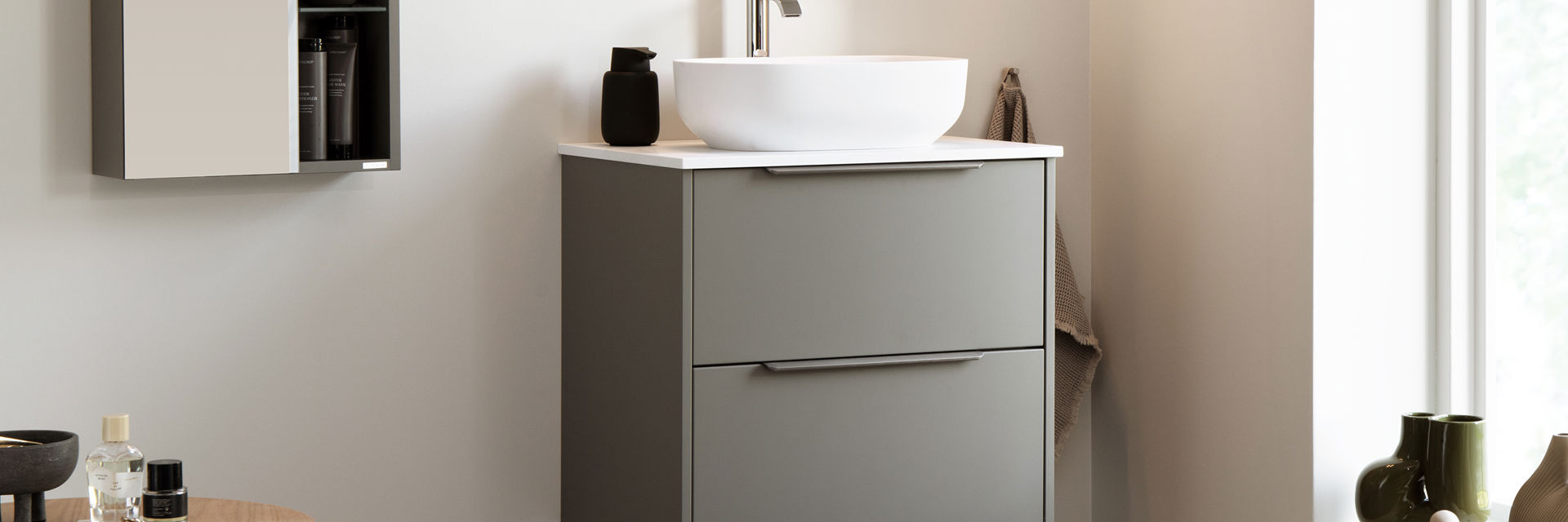 Et baderom med varme, naturlige toner, unikt uttrykk og smarte løsninger. Her har vi brukt Frame med innramming for å understreke møbelfølelsen og detaljarbeidet i servantskapet. Oppbevaringen kompletteres med halvhøyt skap med speil og kombinert åpen og skjult oppbevaring. Lett tilgjengelig og praktisk.