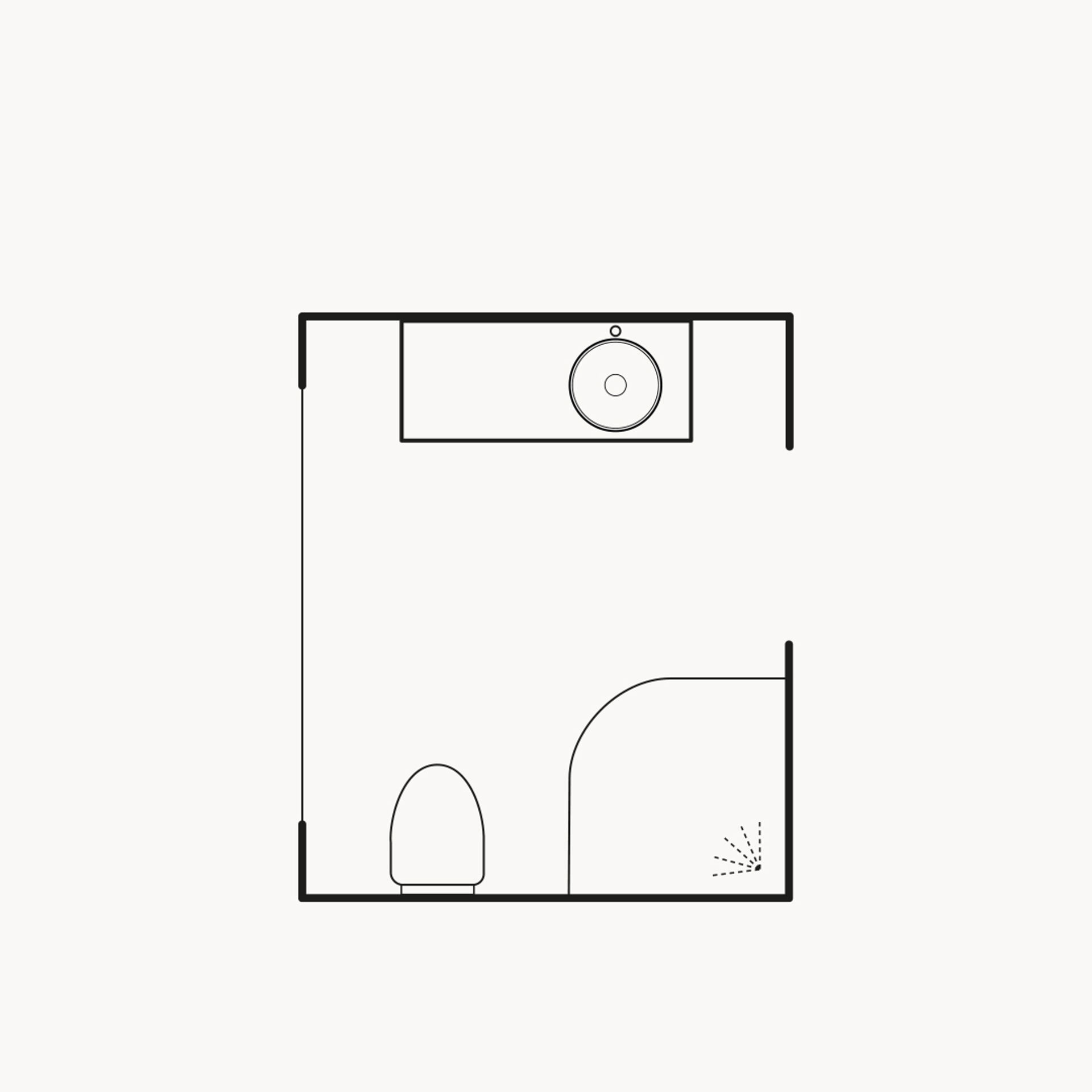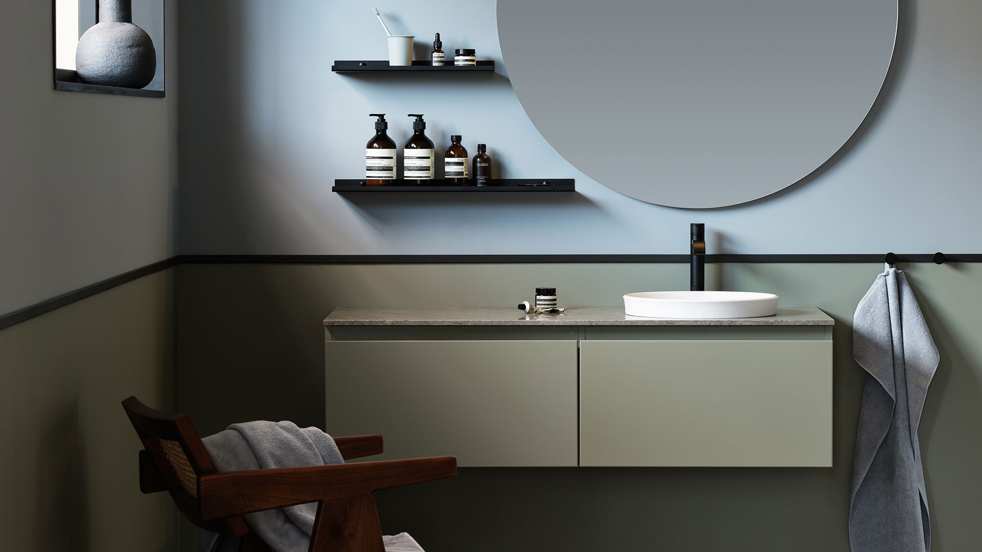 Et lyst og luftig bad med en fargekombinasjon der himmelblått møter grønt. Den taktile topplaten i komposittsteinen Turbine Grey passer fint til den halvt nedfelte servanten Zone. Her får du sjenerøse avlastningsflater ved håndvasken, et stort rundt speil for å skape ekstra plass og luftighet på badet – og hyller i sort metall som gir badet karakter.