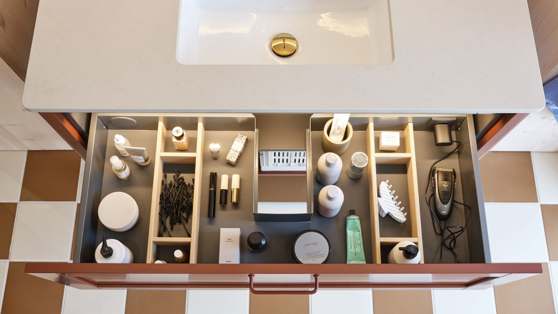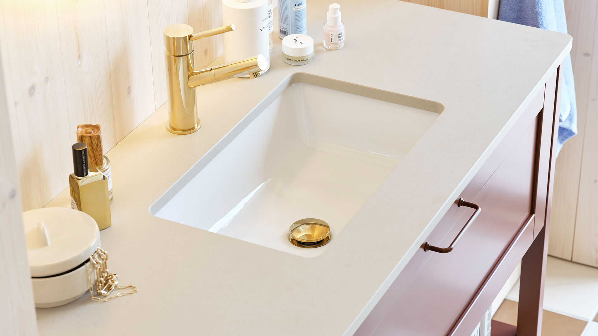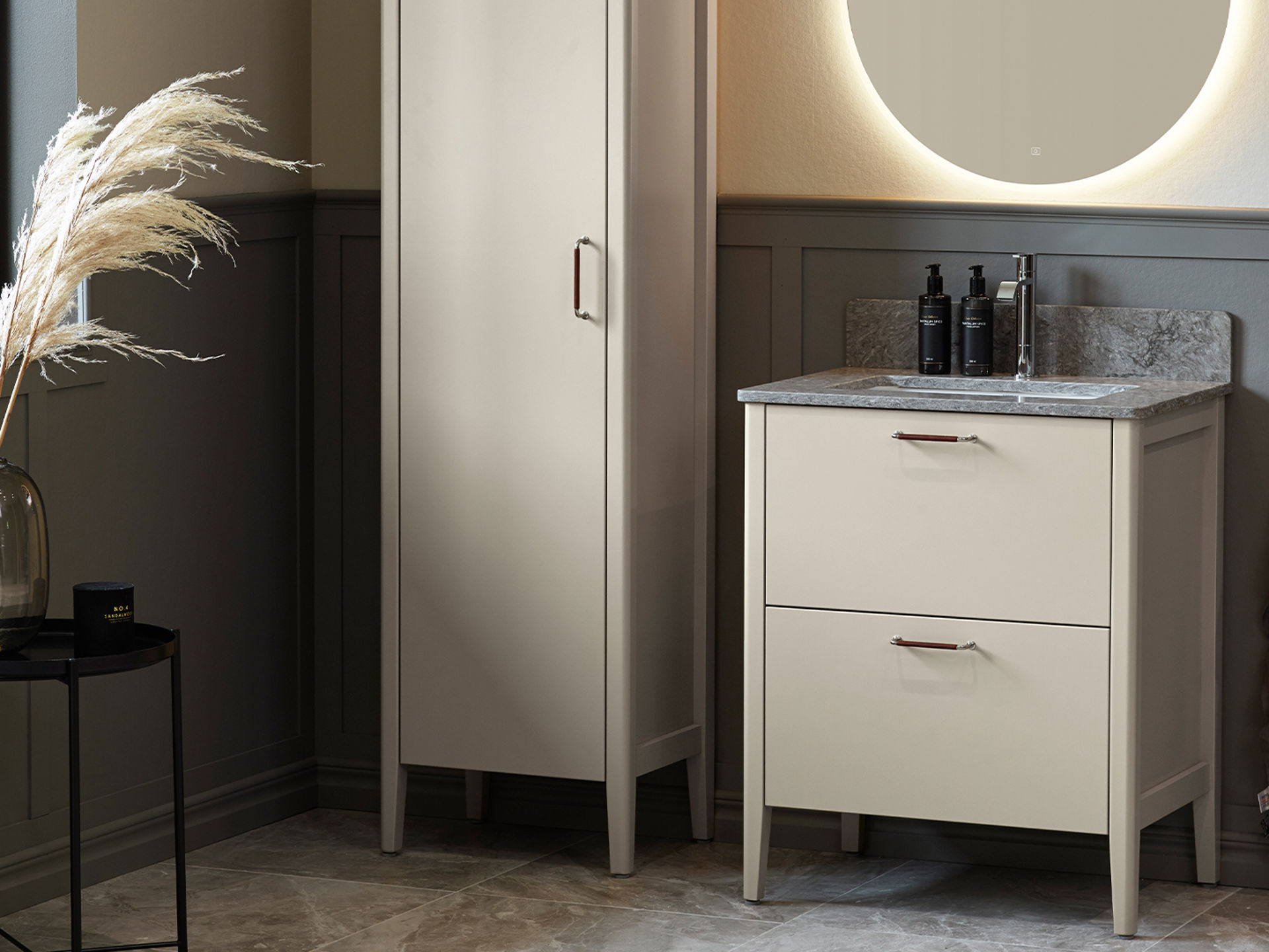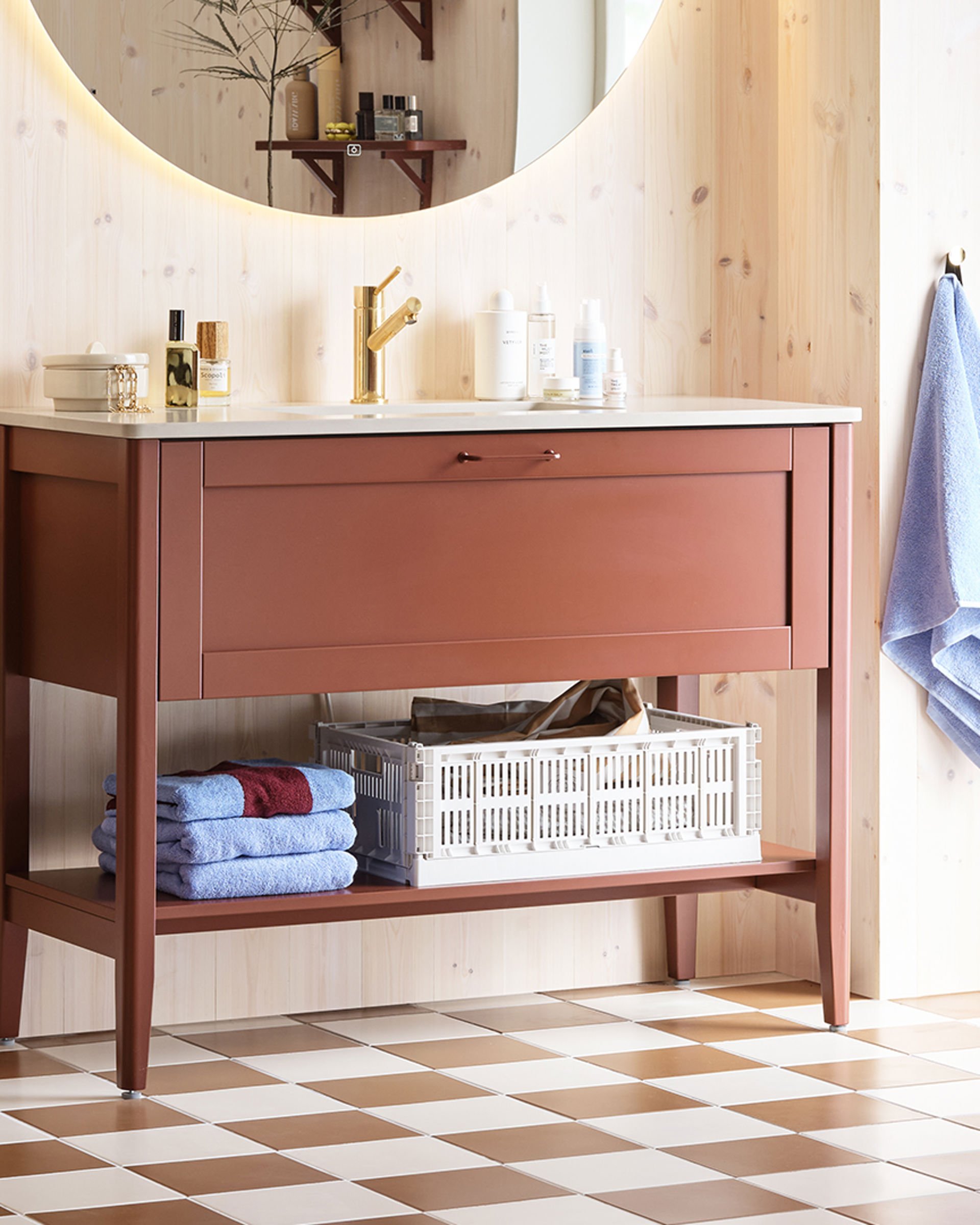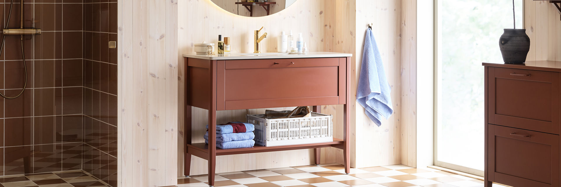 Når Anno finner veien inn på badet, er møbelfølelsen sterk og oppbevaringsplassen raus. I år har vi oppdatert Anno både innvendig og utvendig. Her viser vi Anno i ny bredde, med døren Edit og nye skuffer med ny innredning. I vår nye jordrøde farge, håndtak tone på tone sammen med hvitpigmenterte furuvegger og rutete gulv er Anno virkelig i sitt rette element. De myke formene på møblene gjentas i det runde speilet med fint dekorlys. Tidløst för vår tid.