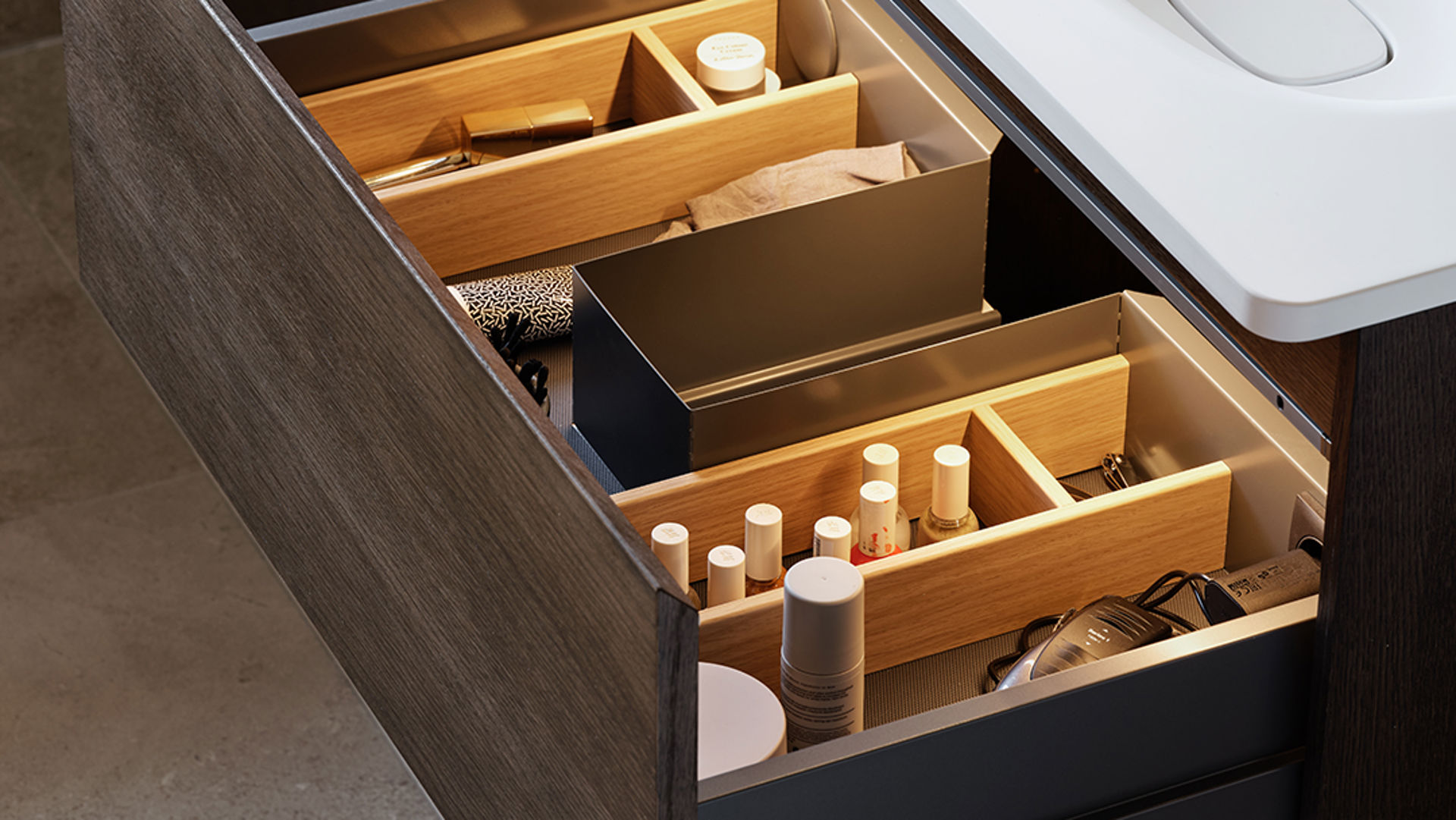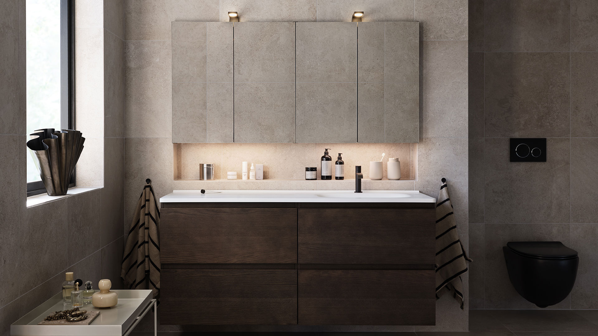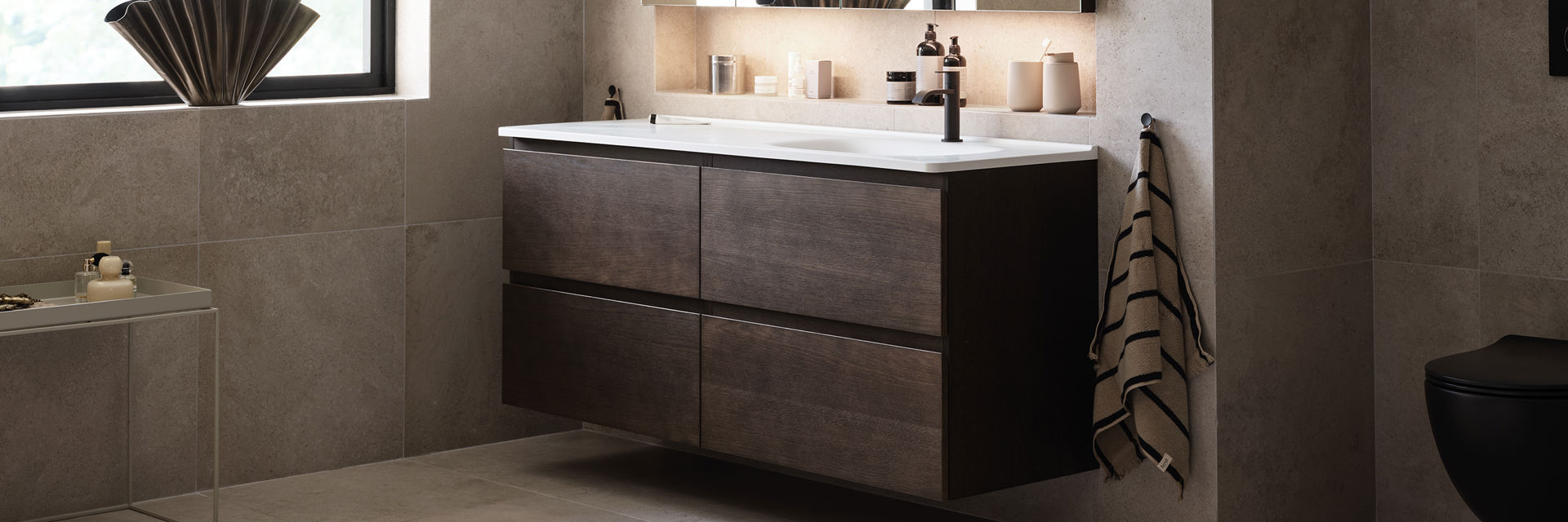 Her vises Flow i vår nye utførelse brunbeiset eik og bredden 1500 mm med høyrestilt vask, noe som gir en sjenerøs avlastningsflate. Et rolig og harmonisk bad med varme naturtoner og eksklusiv følelse. Det halvt innfelte speilskapet med belysning både over og under skaper et gedigent plassbygget uttrykk. Den nye skuffinndelingen Mejram med trefølelse forsterker det elegante utseendet.