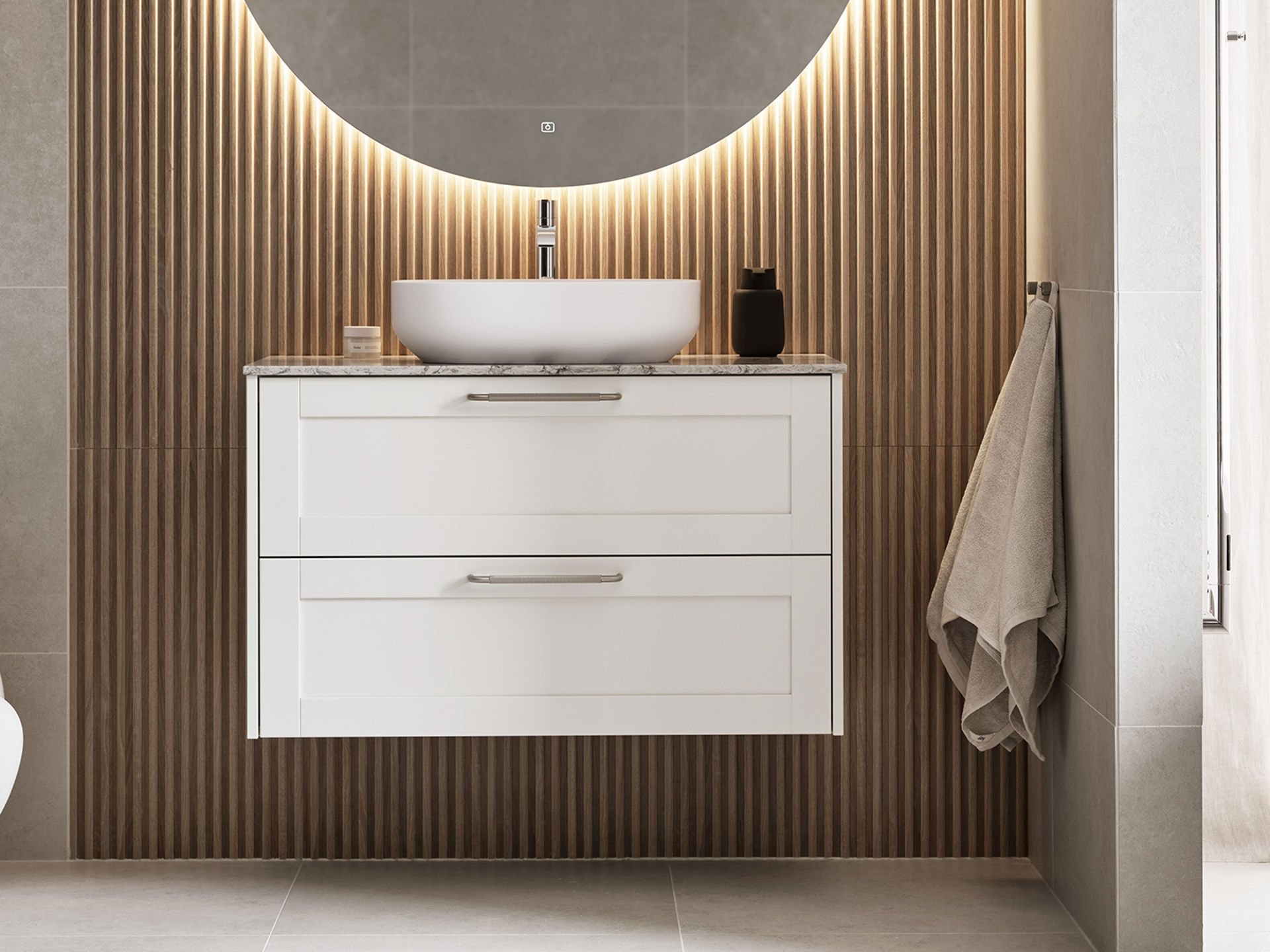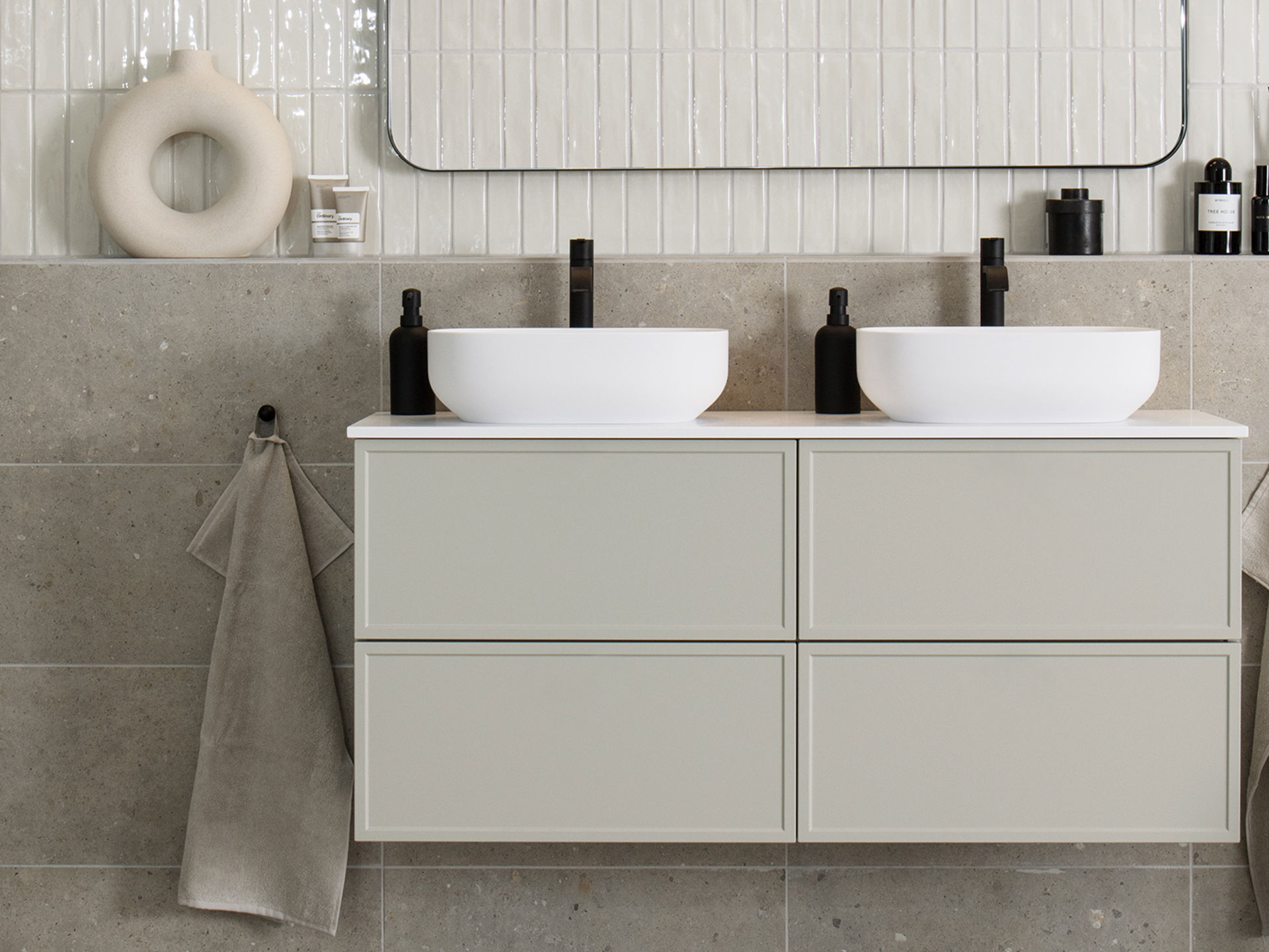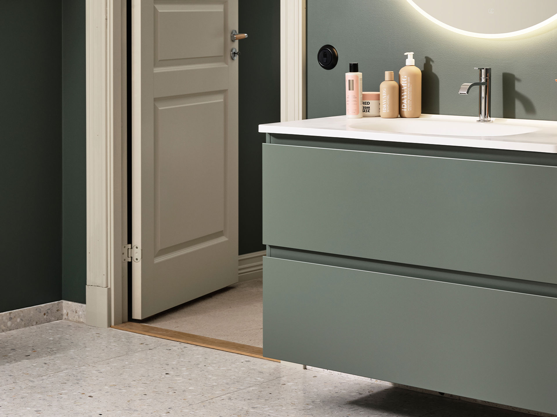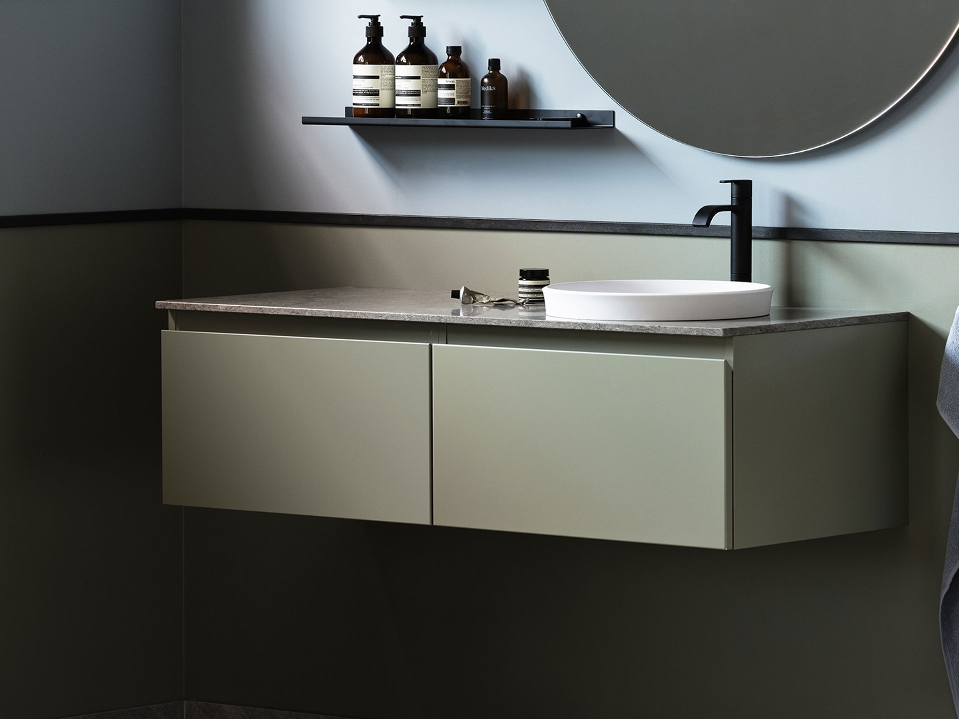 Her vises Flow i vår nye utførelse brunbeiset eik og bredden 1500 mm med høyrestilt vask, noe som gir en sjenerøs avlastningsflate. Et rolig og harmonisk bad med varme naturtoner og eksklusiv følelse. Det halvt innfelte speilskapet med belysning både over og under skaper et gedigent plassbygget uttrykk. Den nye skuffinndelingen Mejram med trefølelse forsterker det elegante utseendet.