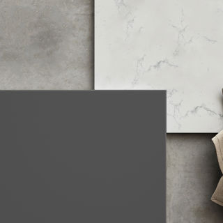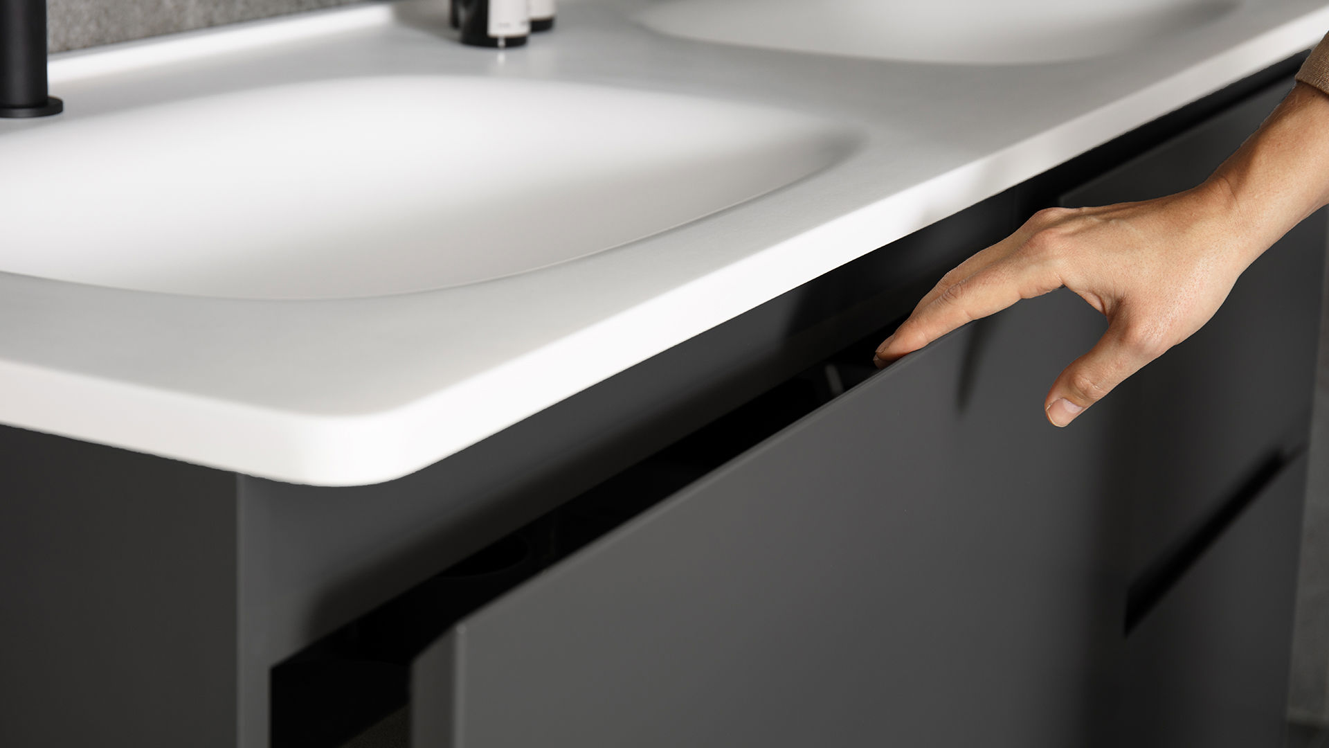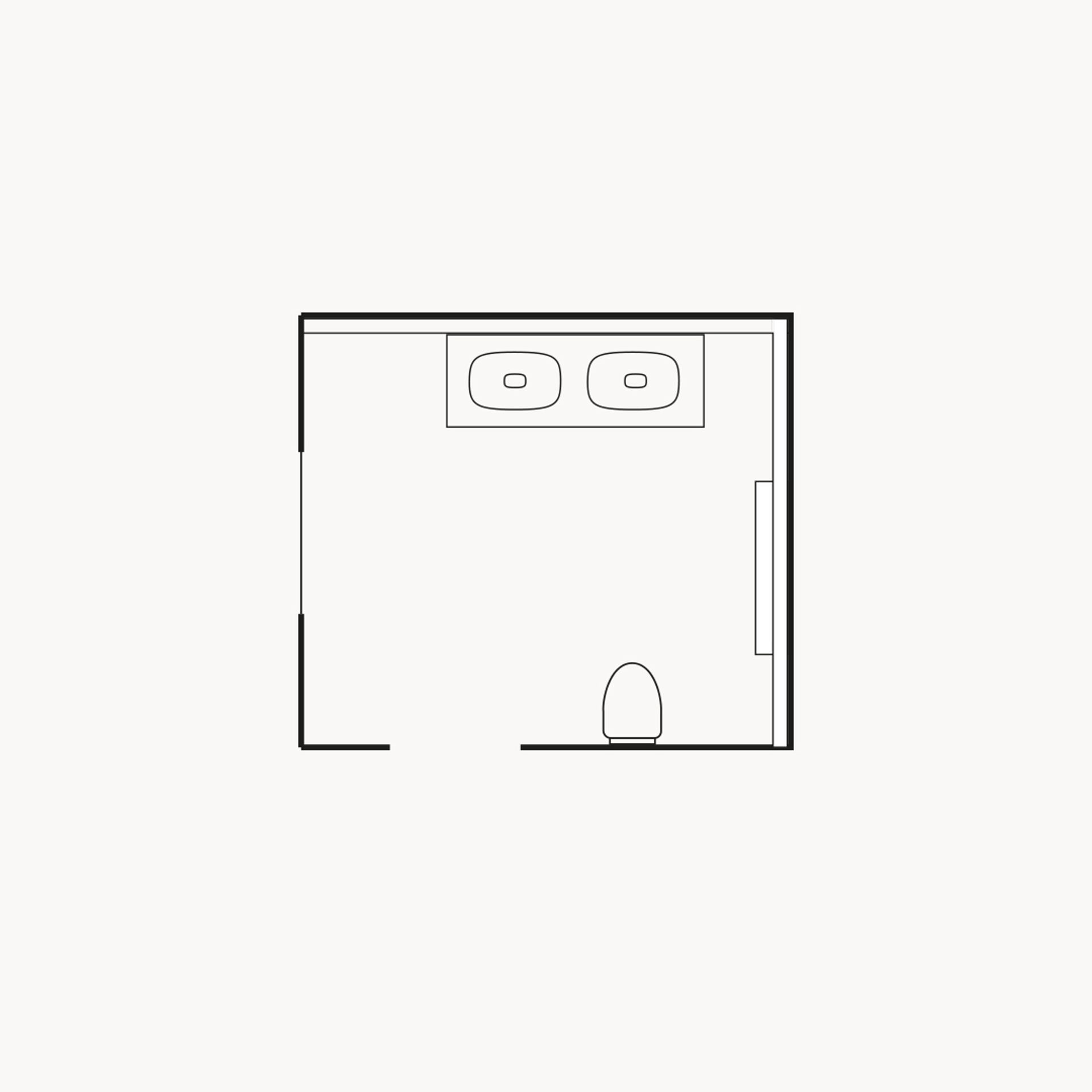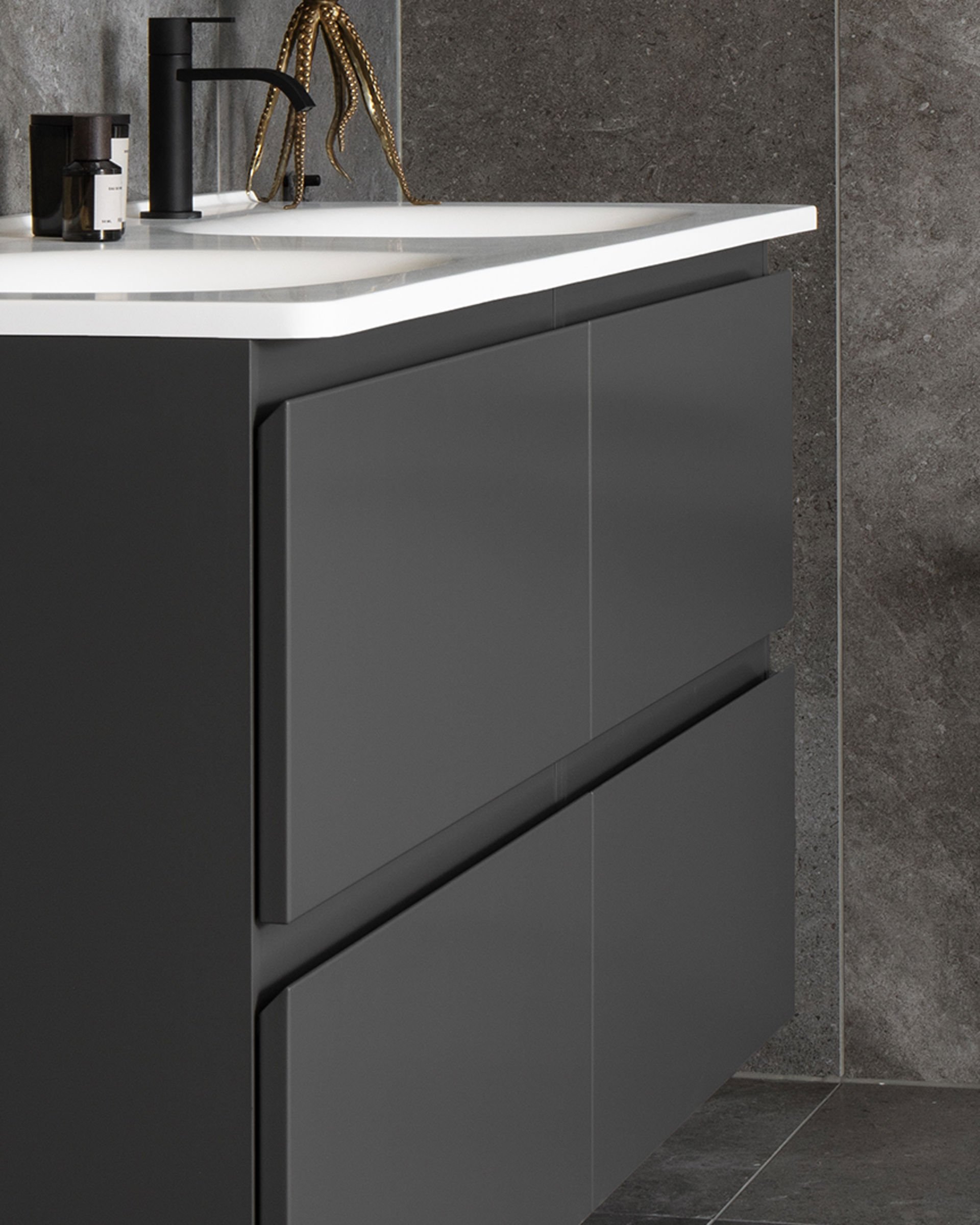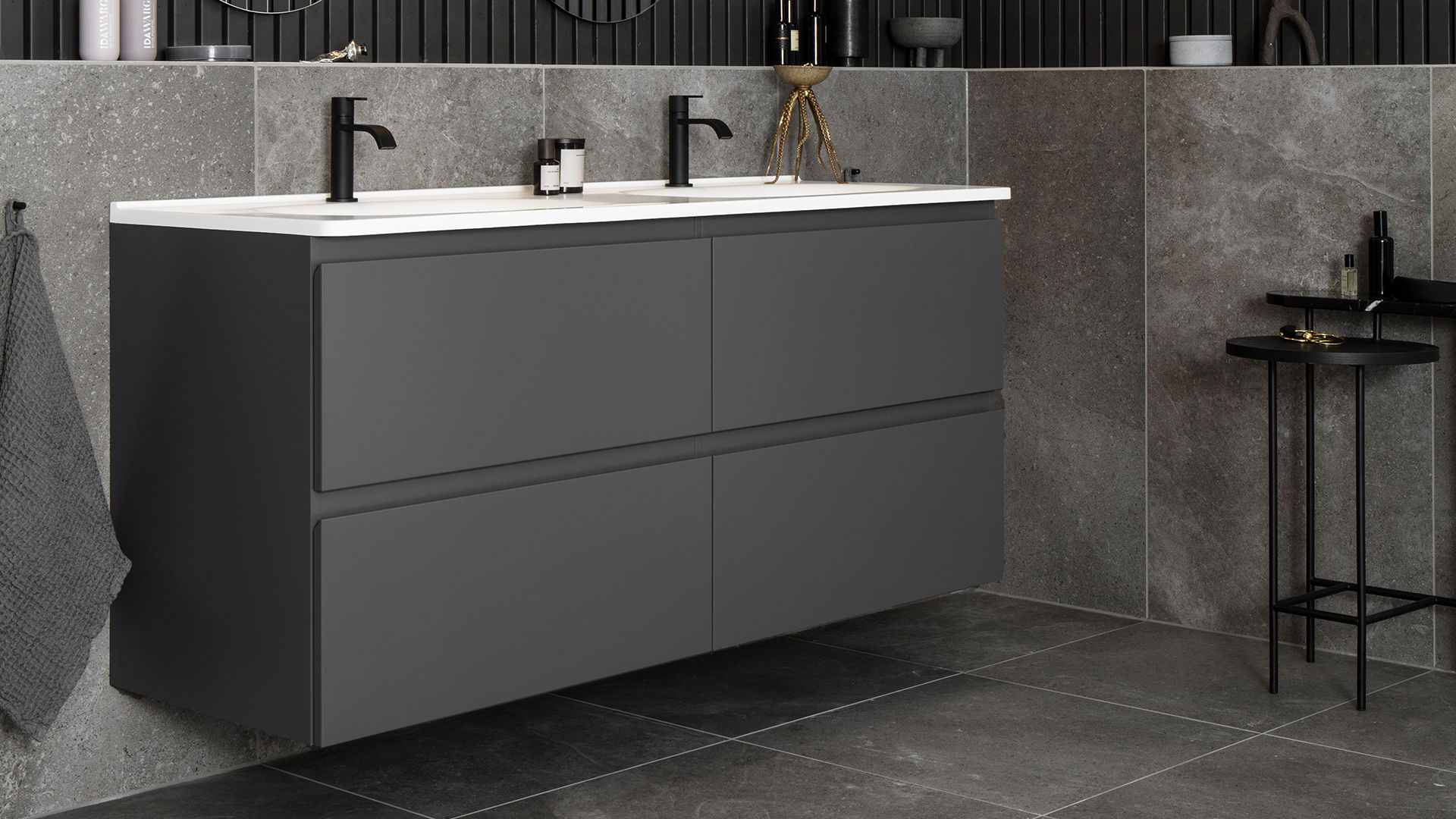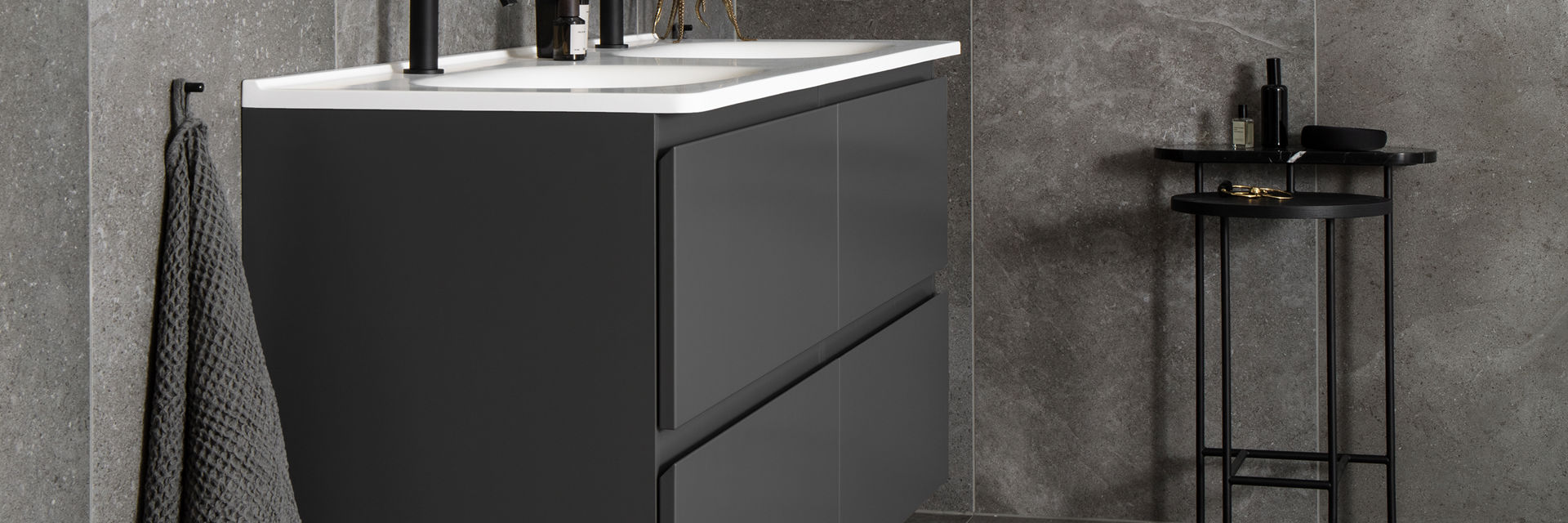 Stein møter tre i matte, mørke farger. Her får servant og servantskap ta godt med plass. Den ribbede treveggen, de sorte vegghyllene og avlastningsnisjen langs veggen forsterker det solide uttrykket. De to ovale speilene Grann gir avbrudd med sin myke form og skaper dynamikk i rommet.