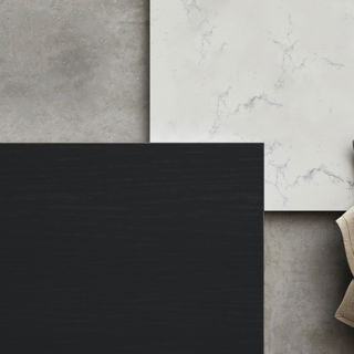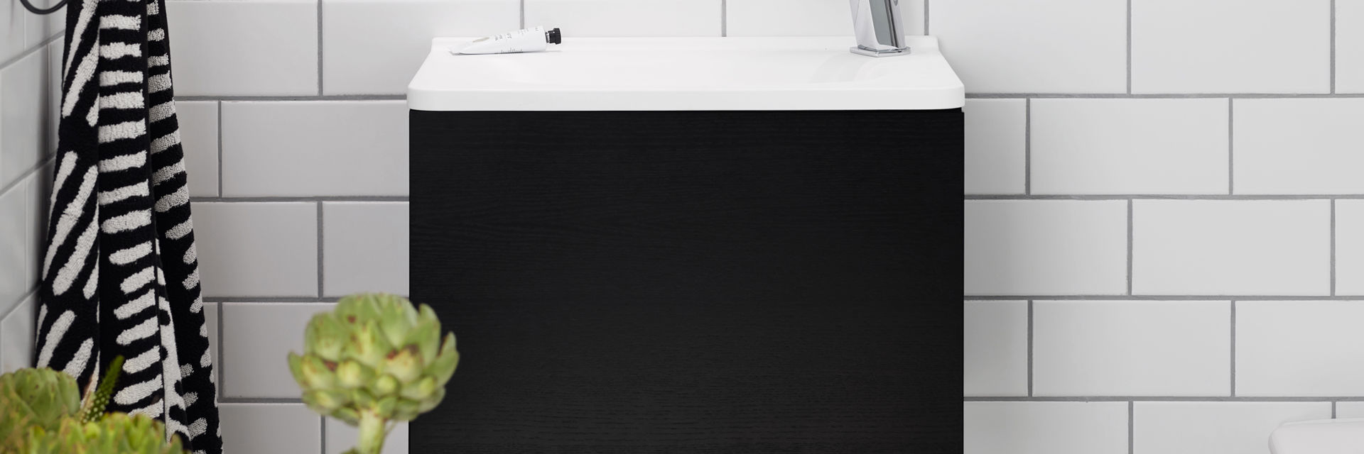 Flow i bredden 500 mm er kompakt, lett å plassere og derfor perfekt til mindre baderom. Her har vi laget et enkelt grafisk miljø i sort og hvitt med rene strippede linjer. Plassen utnyttes effektivt slik at alle funksjoner får plass til tross for den begrensede overflaten. Tidløst bølget mønster på gulvet gir liv til rommet.
