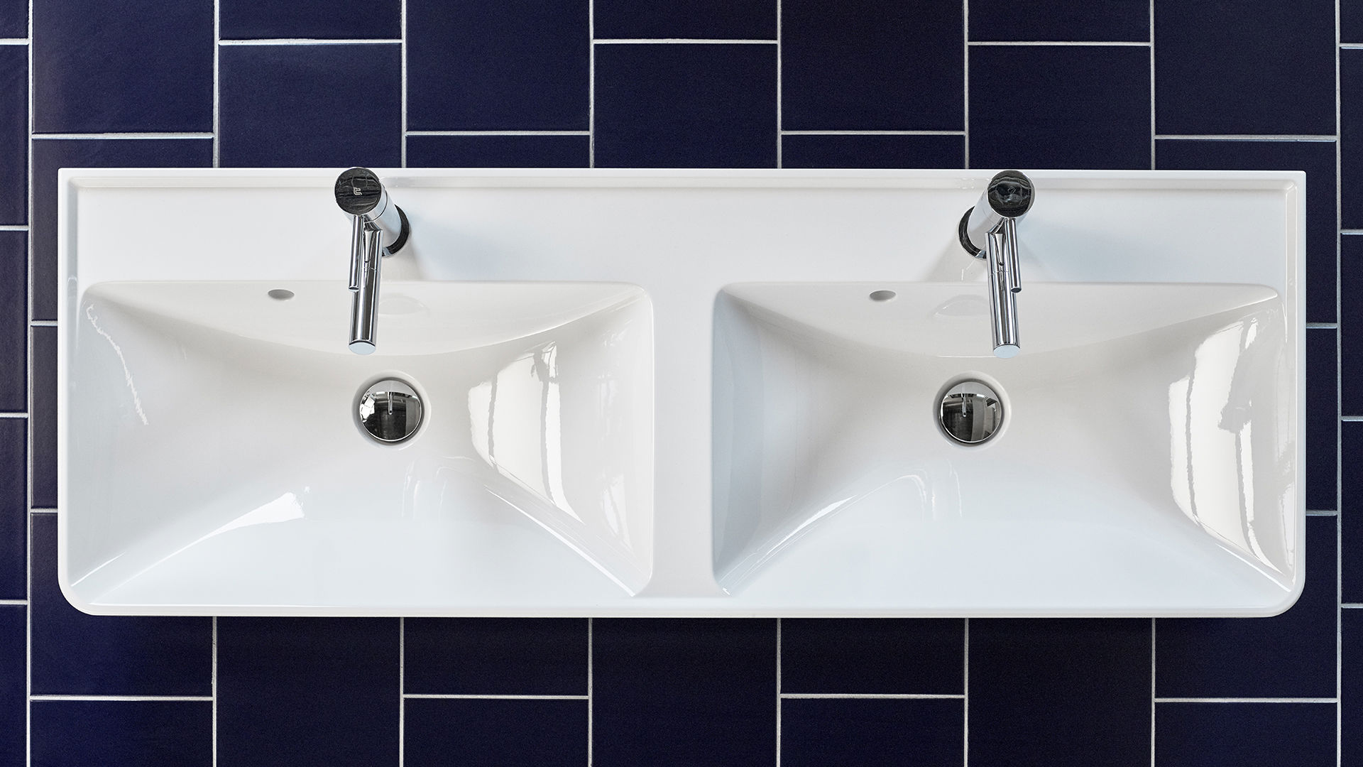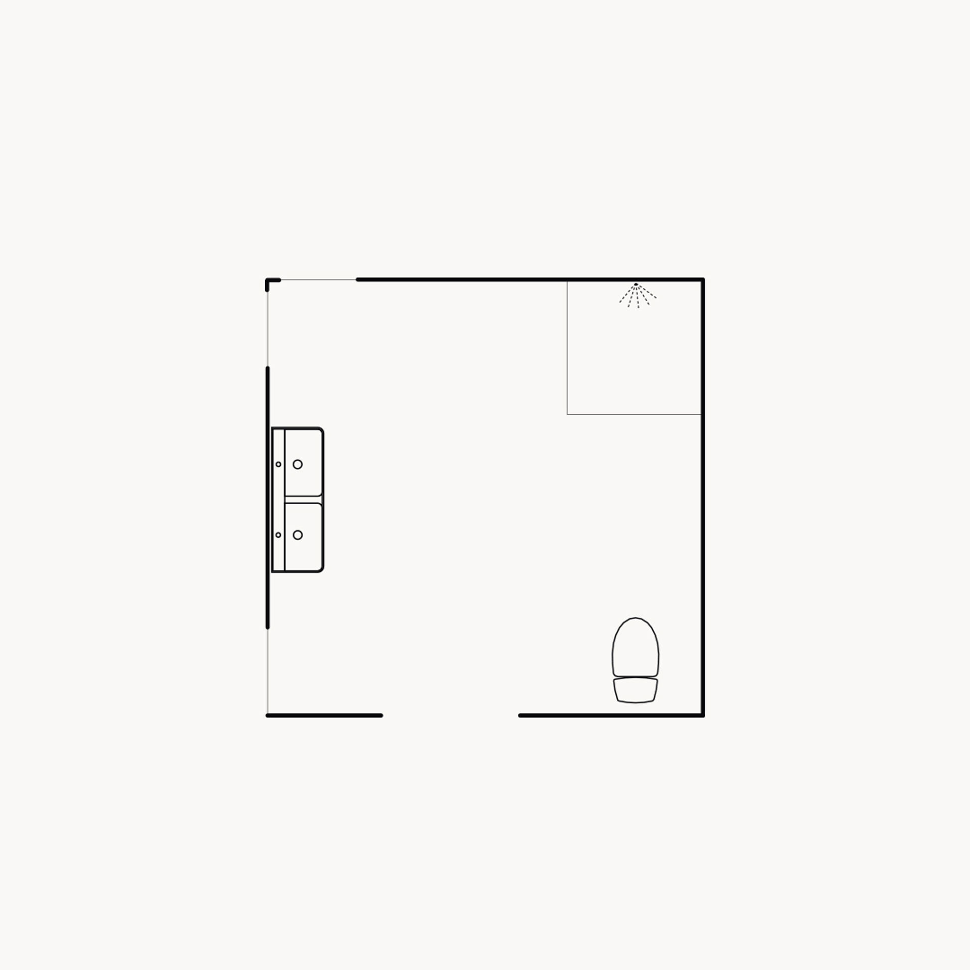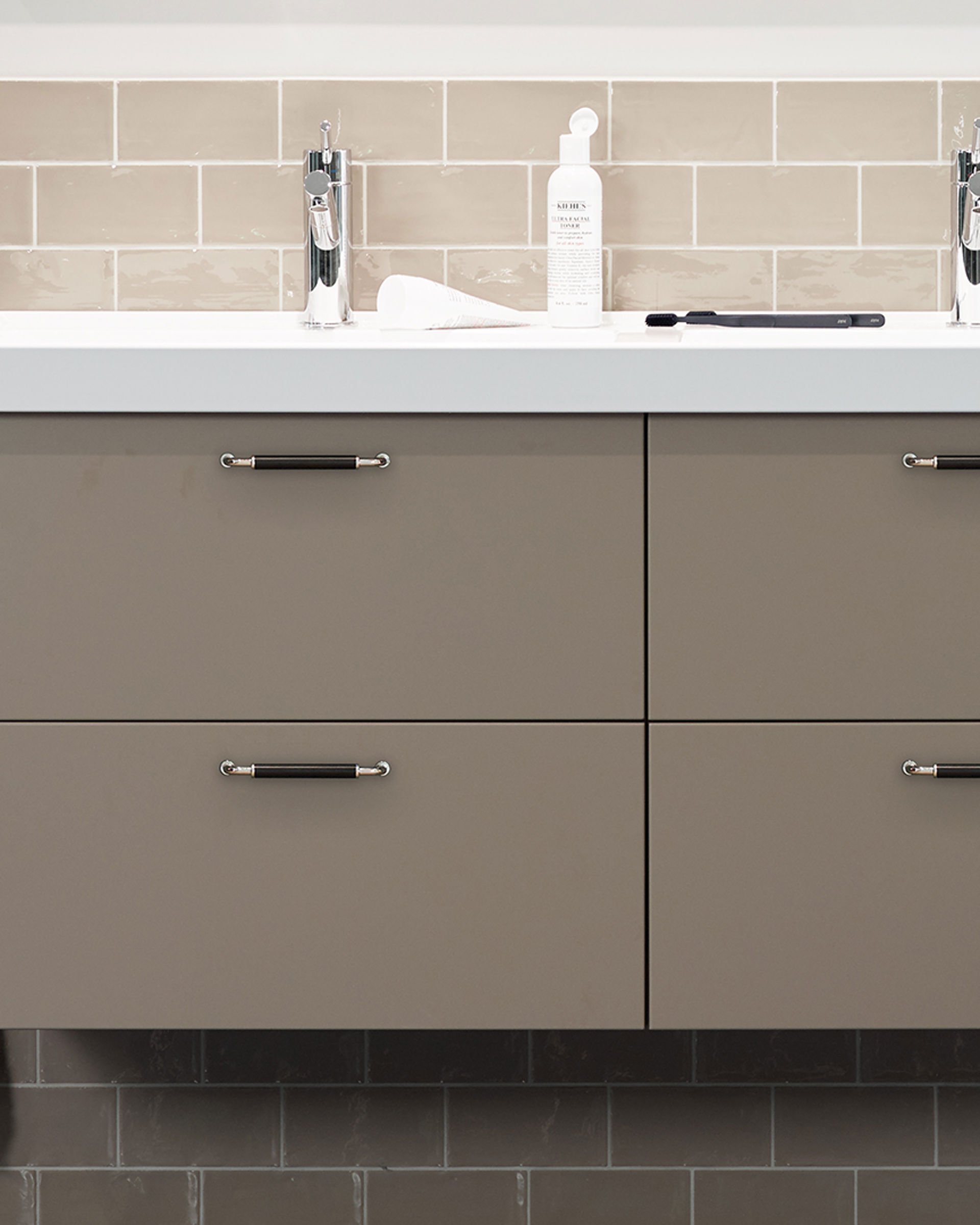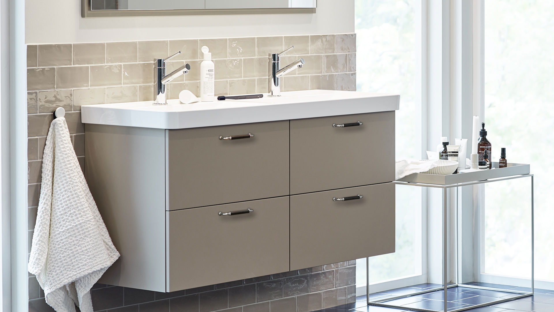 Et baderom der det er plass til flere. Den praktiske dobbelservanten er relativt kompakt og lett å plassere. Her har vi valgt en tone som går i rolig sandbeige, kombinert med et litt overraskende blått gulv. Flisene dekker halve veggen for å skape variasjon og dynamikk. Velkommen inn til hele familien!