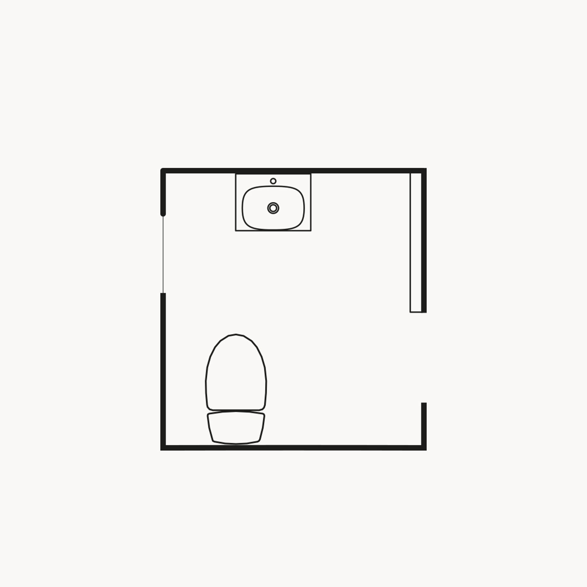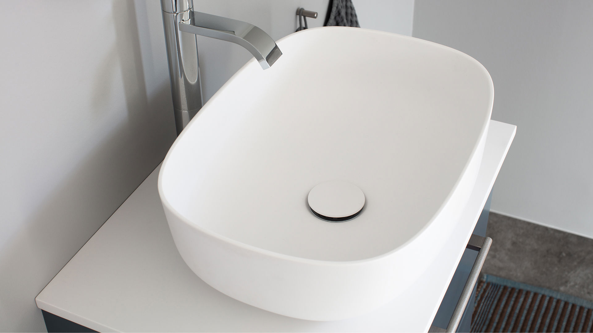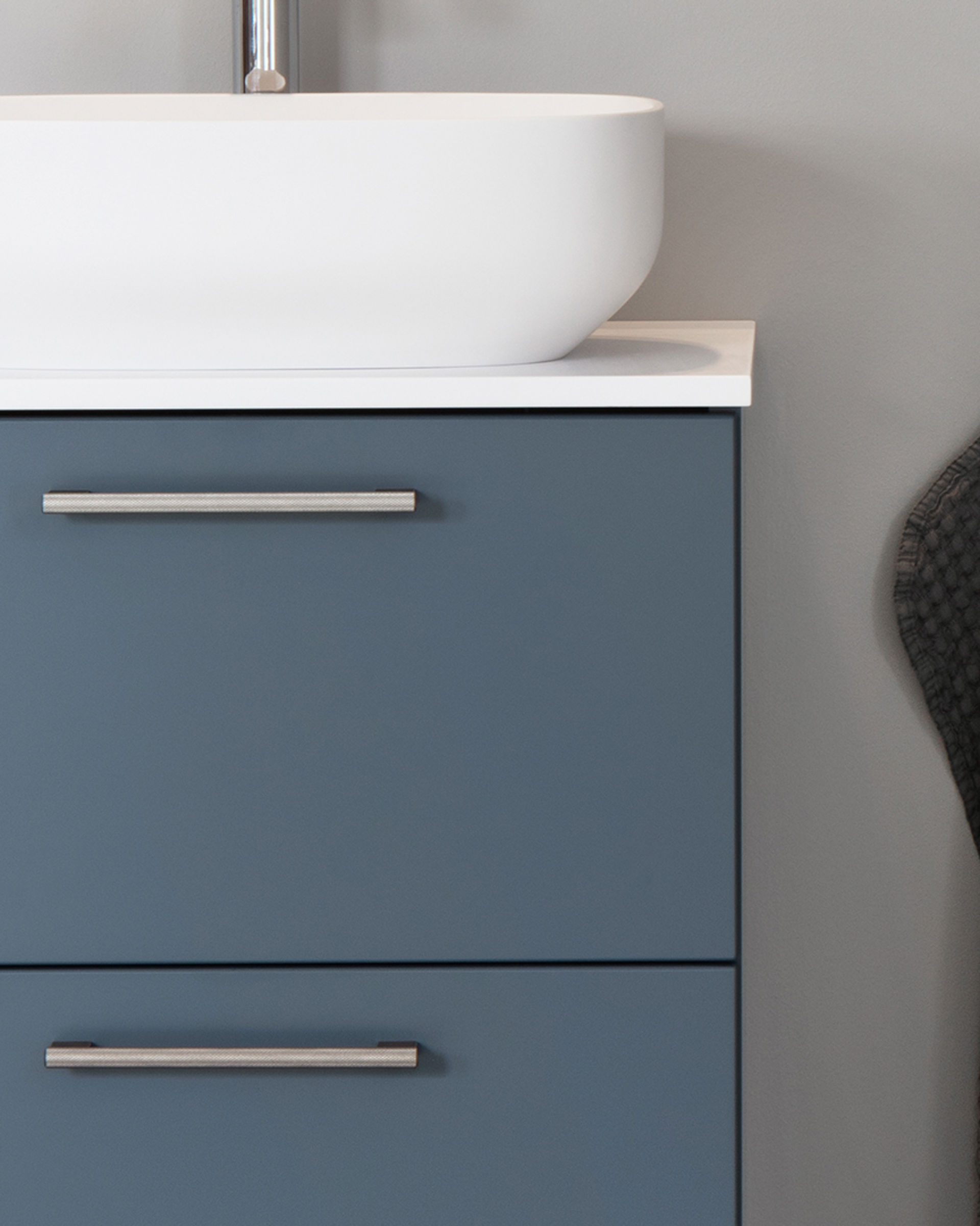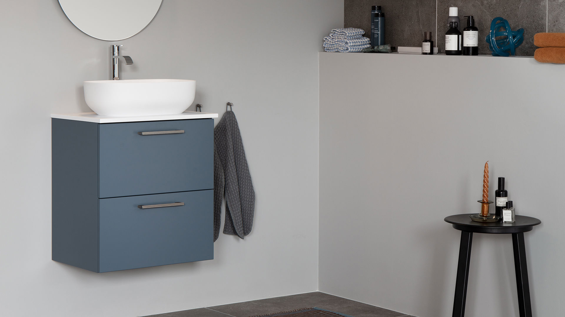 Et stilrent og enkelt miljø for det lille baderommet. Det strippede uttrykket mykes opp av de avrundede formene i den ovenpåliggende servanten Soprano og speilet Grann Det tordenblå møbelet kombineres med nøytrale farger på gulv og vegg. Oppbevaringsnisjen er en både fin og praktisk detalj.