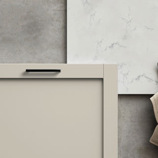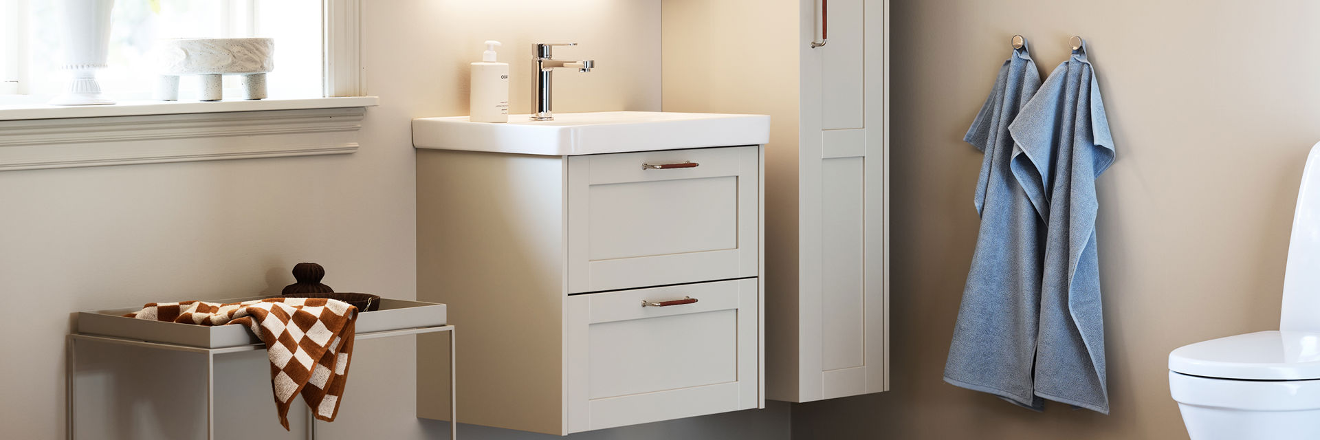 Moderne linjer med fine klassiske detaljer. På dette lille badet med myke toner har vår rammedør Edit fått et klassisk uttrykk i kombinasjon med innrammingen Frame og den stilrene servanten Mezzo. Speilskapet Ramsen rammes inn på samme måte som servantskapet, og sammen med skuffer i servantskapet og høyskapet skaper det maksimal oppbevaringsplass på et lite område.