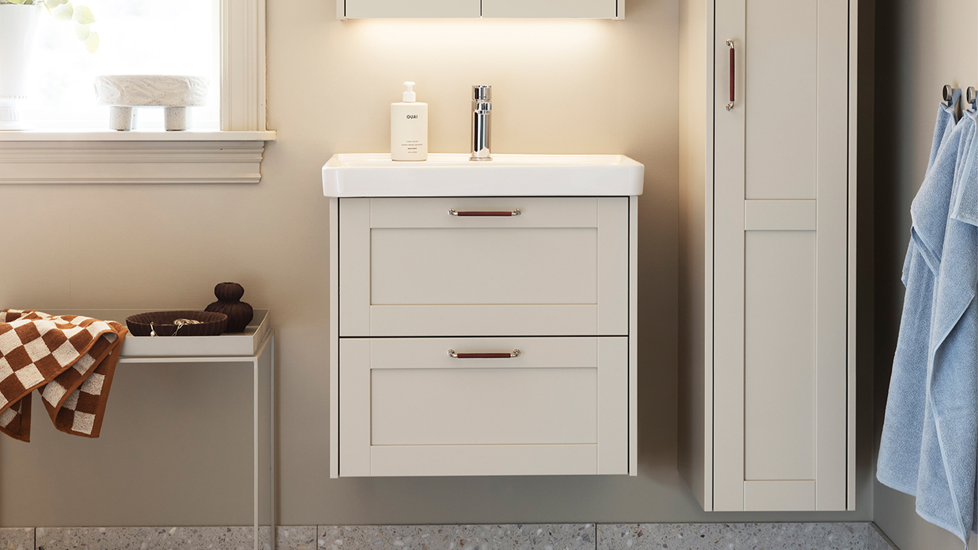 Stilrene linjer og myke toner på et lite bad med mye oppbevaring.