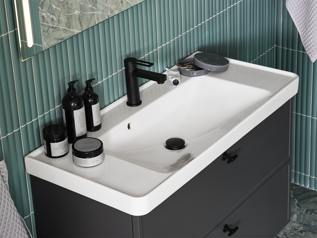 Mezzo-serien fås i breddene 500, 600, 900 og 1200 mm og med dører i alle våre standardfarger. Du kan velge enten Mezzo servant i porselen med Easy Clean-vannlås, eller den toppmonterte, avrundede servanten Soprano i Solid Surface med topplate i Solid Surface, komposittstein Moorland Fog eller Turbine Grey og vannlås som standard. Velg en uinnrammet kommode med dør Maja eller Thea, eller en innrammet kommode med dør Moa eller Edit. Avslutt med et håndtak eller en trykkfunksjon som passer din stil. Mint-skuffedeler og gummimatte er inkludert.