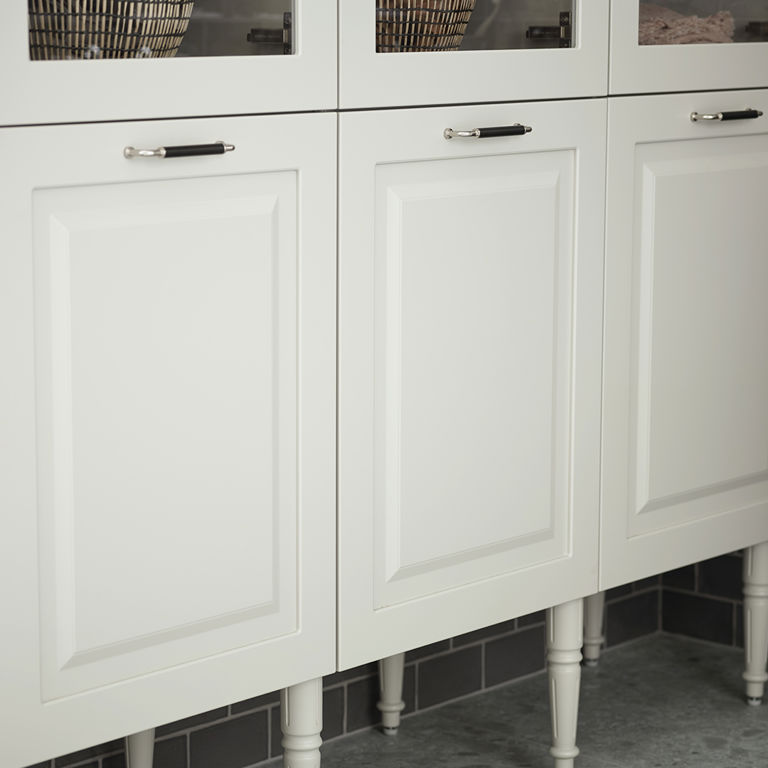Malt dør av 19 mm MDF-plate med frest profil og lett avrundet kant. Finnes også som vitrineskap med klart glass for høyskap. Tilgjengelig i hvitt eller i en av våre farger.