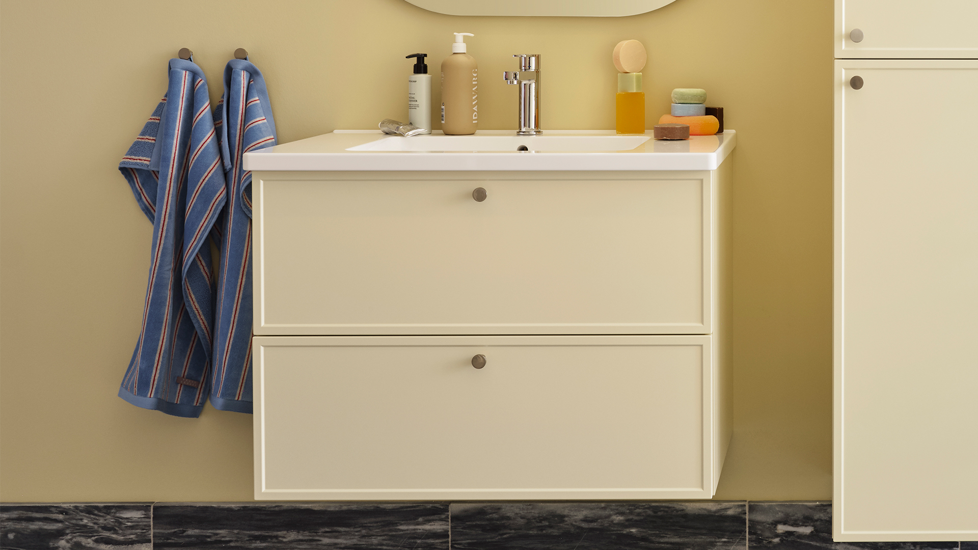 Malt dør av 19 mm MDF-plate med frest profil og lett avrundet kant. Finnes også som vitrineskap med klart glass for høyskap. Tilgjengelig i hvitt eller i en av våre farger.