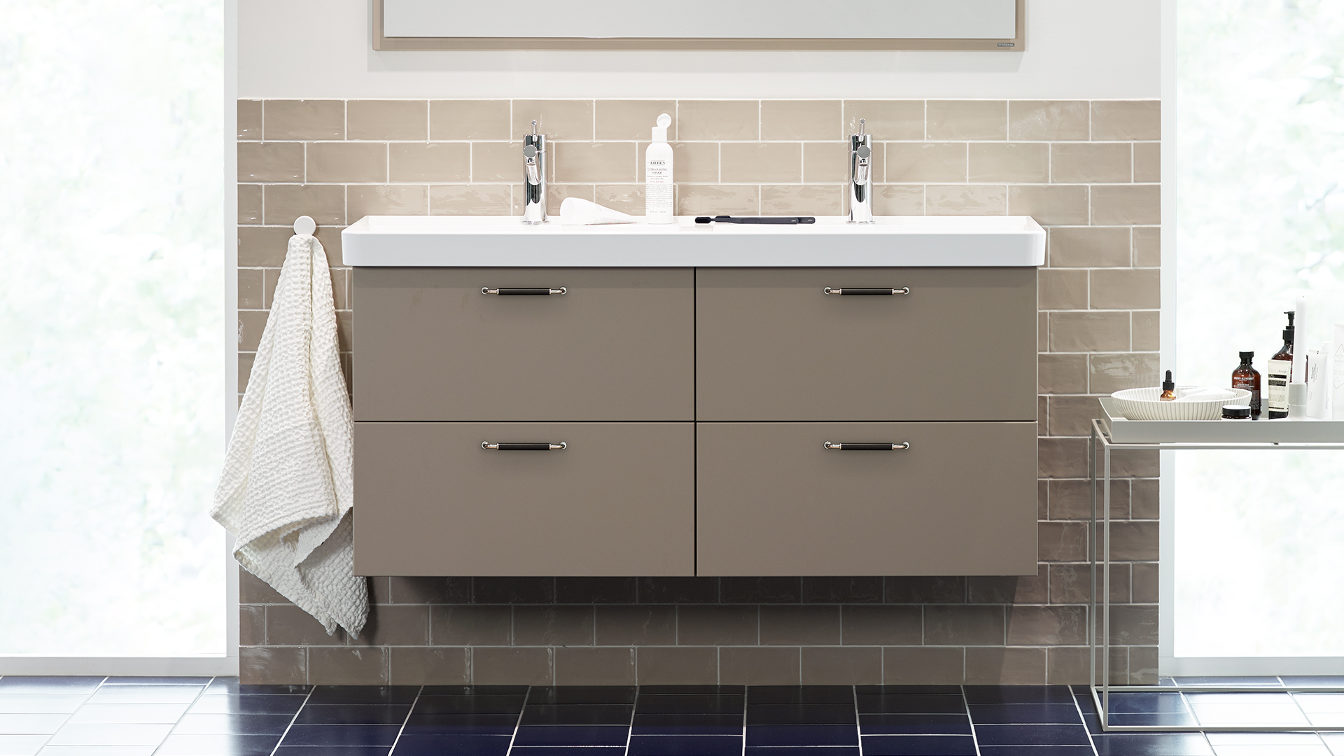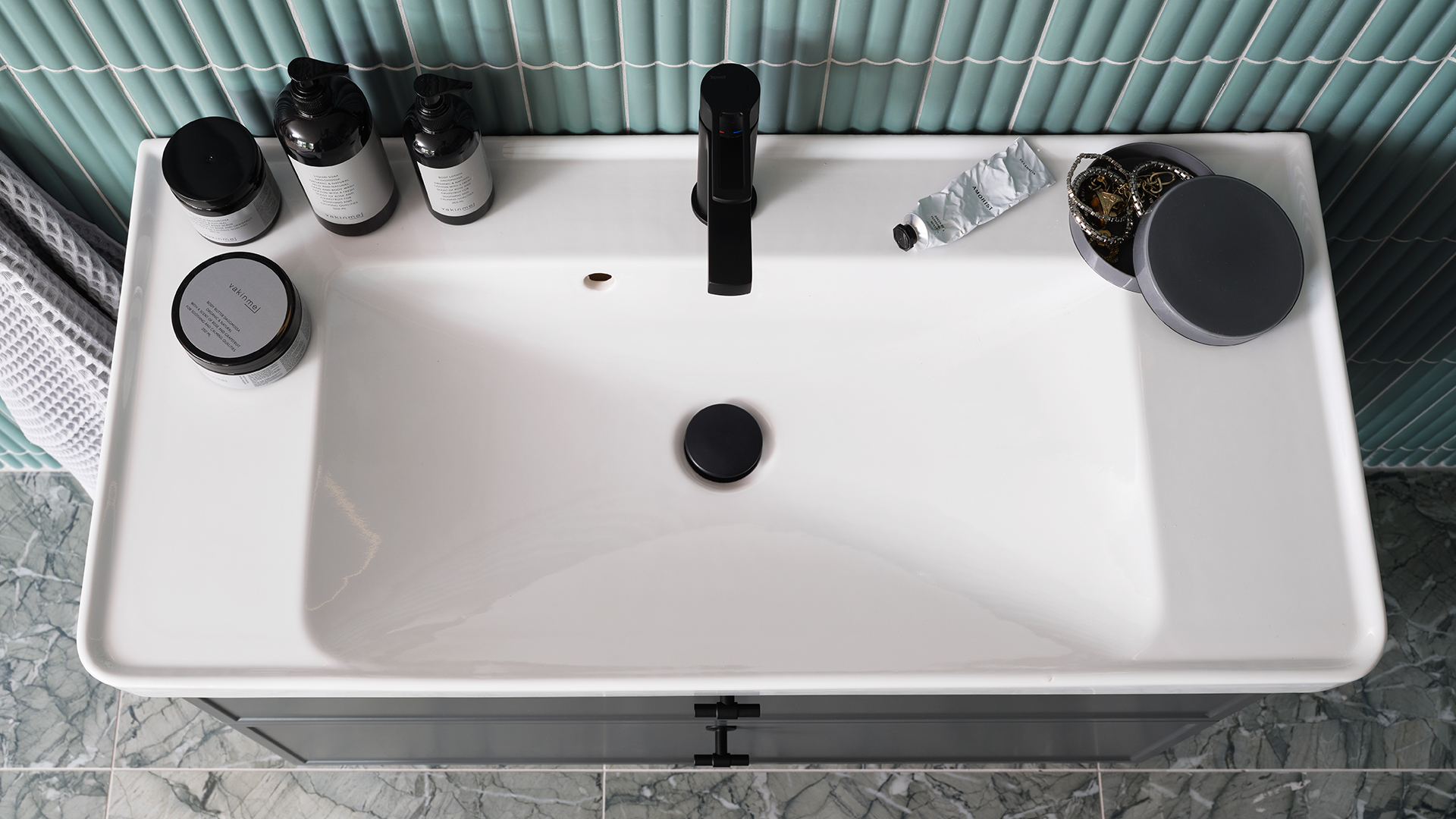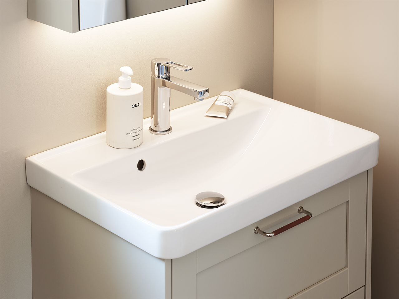 Servanten Mezzo er en porselensservant som er sjenerøs og samtidig lett å plassere, siden den er litt grunnere enn vanlig. Det som kjennetegner servanten, er den markerte kanten som er inspirert av formen på en porselenskopp.