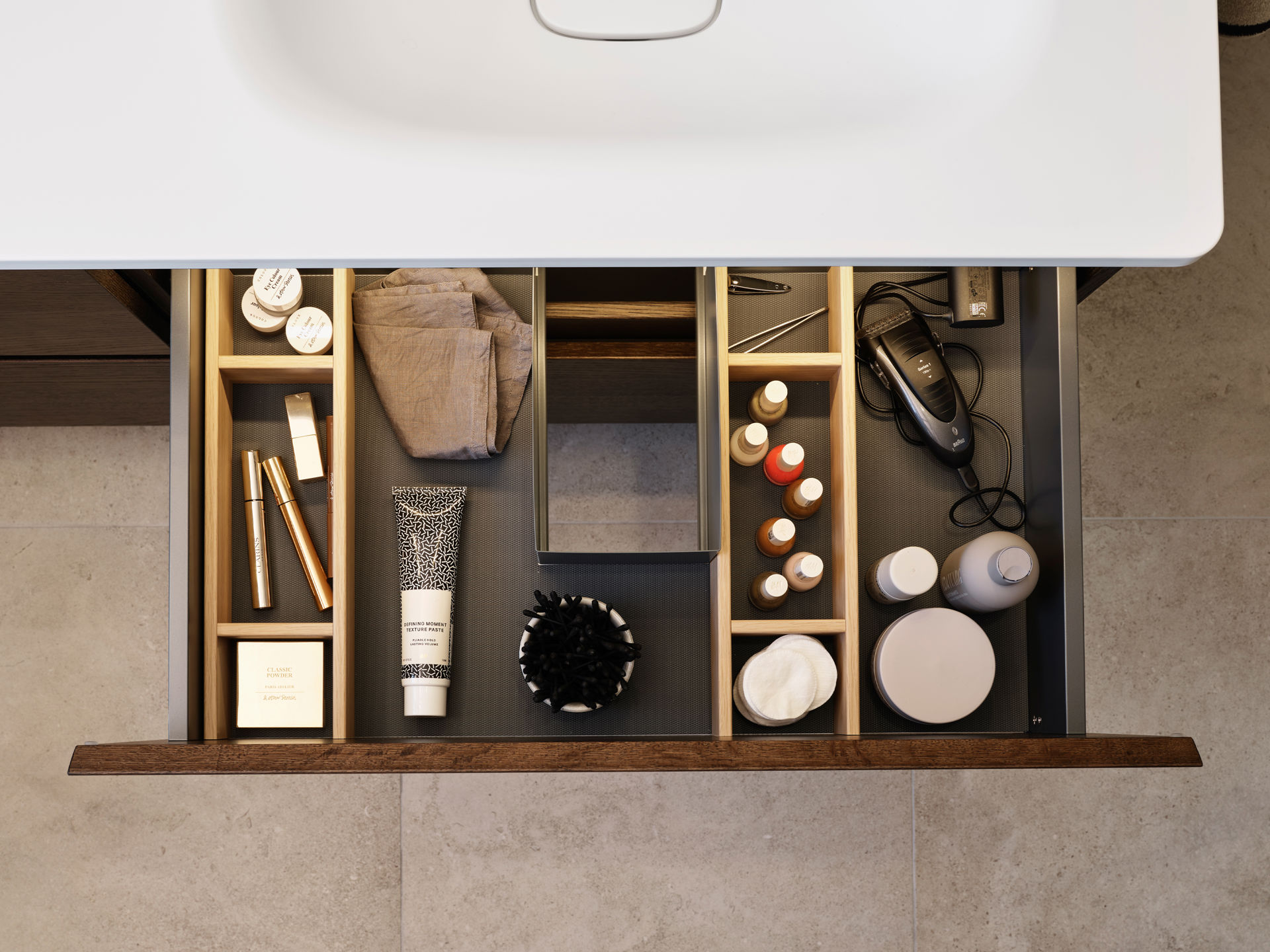 Kommod med lådor med dämpning och fasad greppkant. Lådindelning Mejram och gummimatta ingår. 230V eluttag går att beställa som tillval till låda, lägg till U efter artikelnumret.