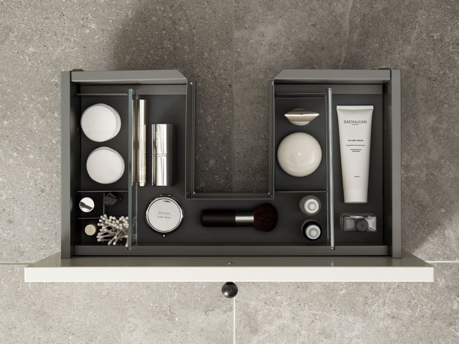 Kommod med fyra lådor. Lådindelning Mynta och gummimattor ingår. Kan fås med pushfunktion, lägg till P efter artikelnumret. 230V uttag går att beställa som tillval, lägg till U efter artikelnumret.
