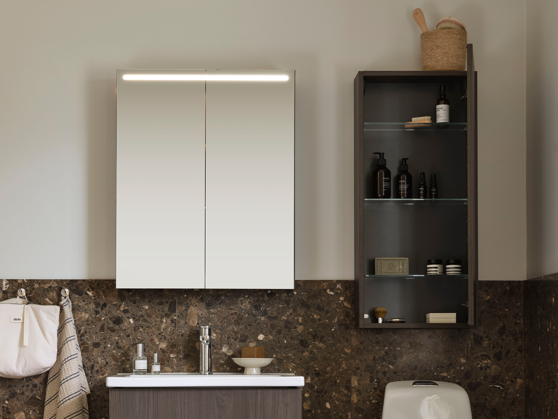 Överskåp med lucka för valfri hängning. Tre flyttbara glashyllor.