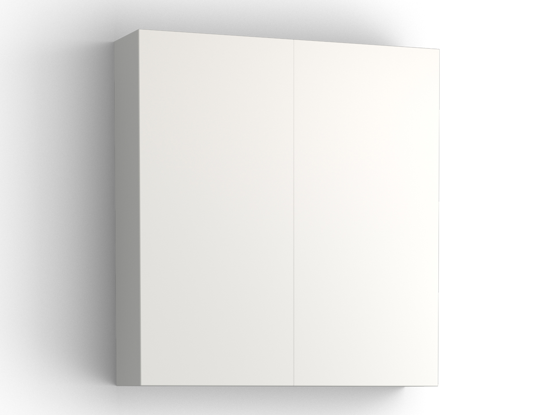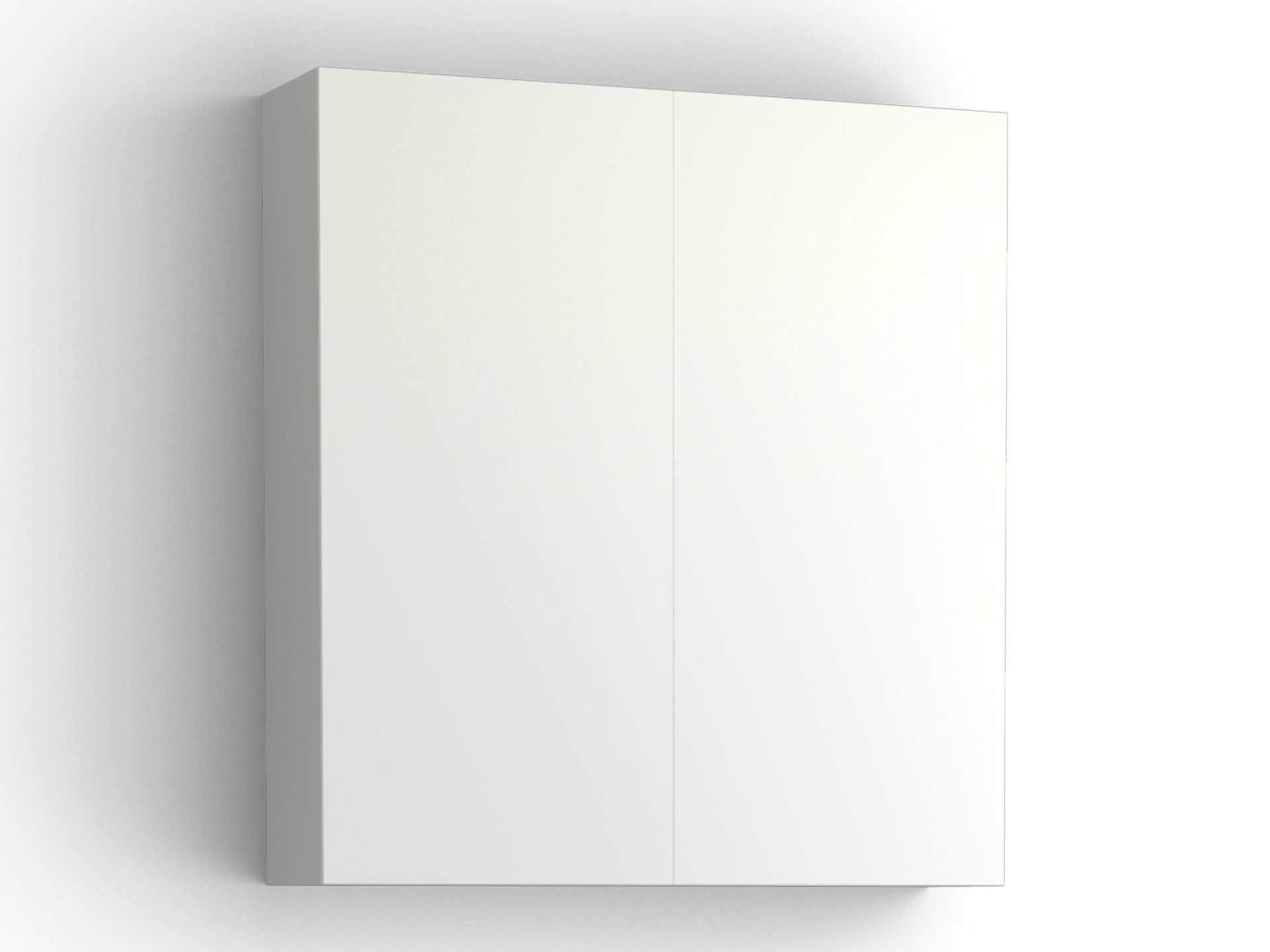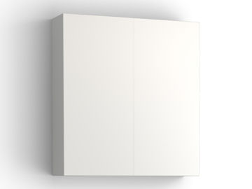 Spegelskåp Basic med vit stomme med två dubbelsidiga spegelluckor med dämpning och två flyttbara glashyllor. Spegeln kan vinklas ut 125 grader.