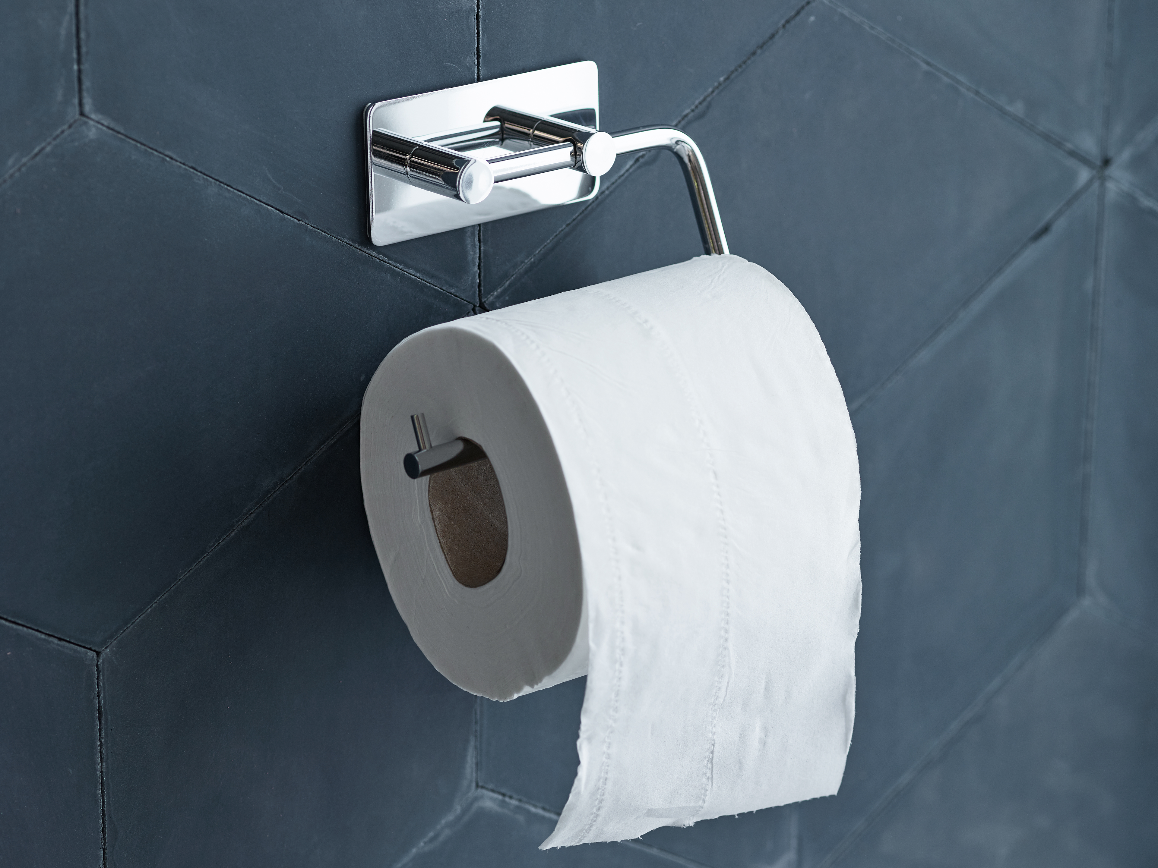 Rostfritt stål med kromfinish. Självhäftande baksida. Enkel att montera utan att borra.