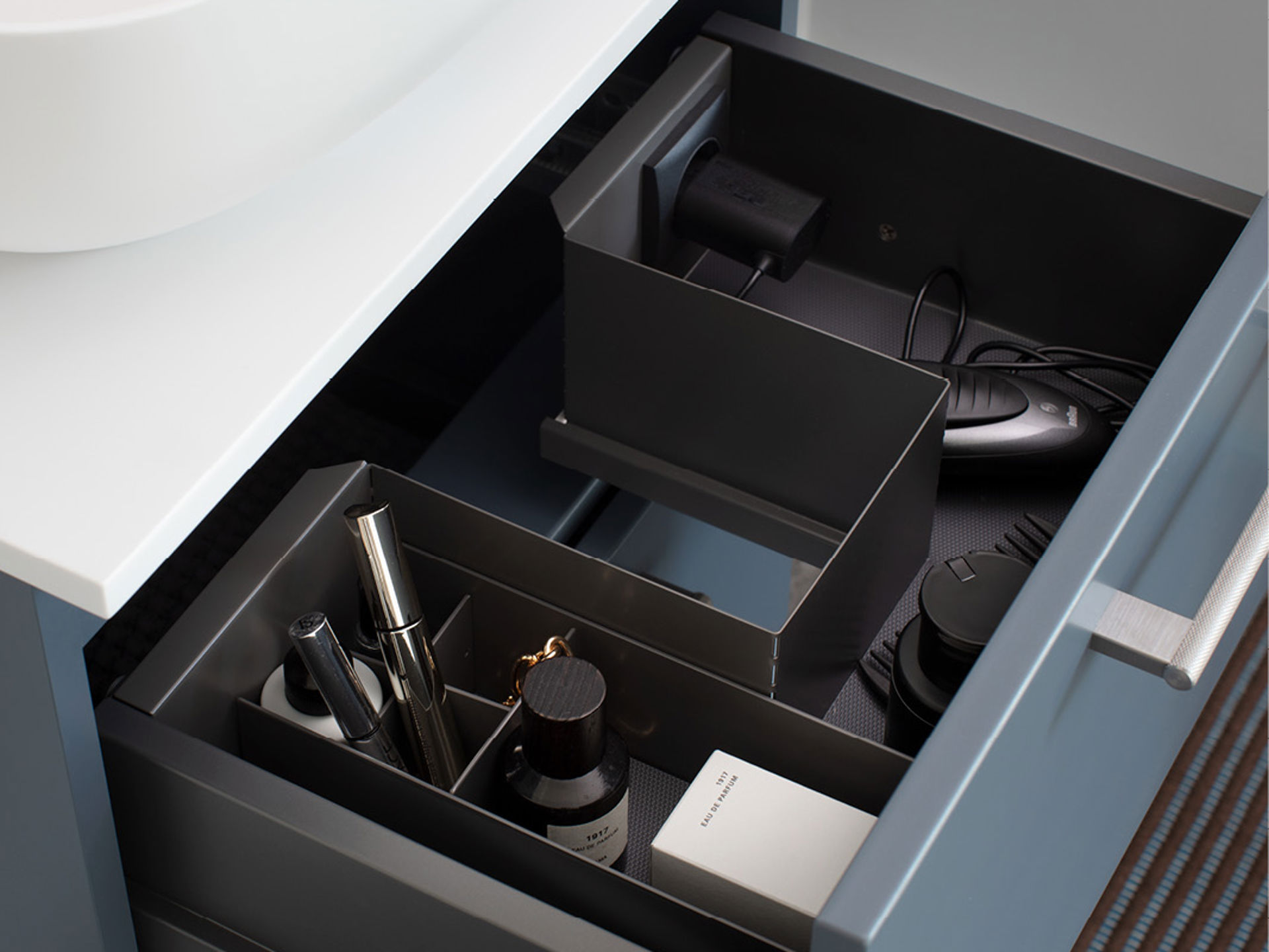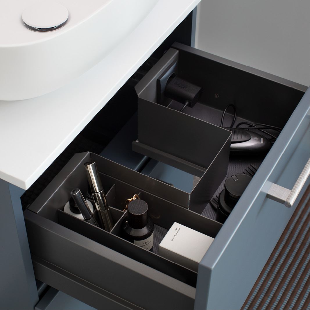 Lådindelning Kapris i grålackad metall. Välj mellan lådavdelare och lådinsats. Gummimatta ingår. För kommod Mezzo och lådor med 270 eller 300 mm djup.