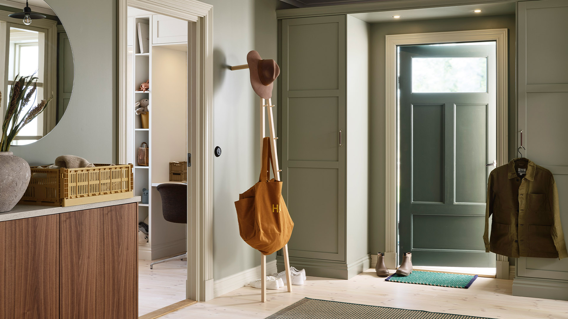 I denne innbydende gangen trenger man ikke å trenge seg sammen. De romslige garderobene som rammer inn inngangen gir et plassbygd uttrykk med de fremtrukne soklene og den dempede grønntonen som går igjen på veggene. Den rolige og harmoniske følelsen i rommet forsterkes ytterligere av det runde speilet og det halvhøye oppbevaringsskapet i valnøtt. Velkommen inn!
