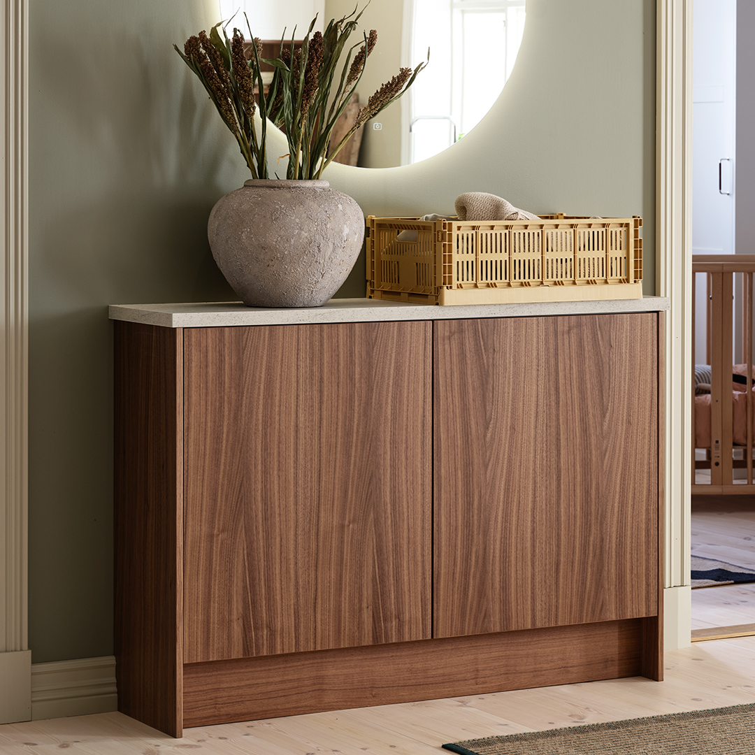 Molly har en skandinavisk stil med et livlig uttrykk. Den finerte, glatte fronten har stående finer som skaper en kobling til naturen og dens stadig skiftende karakter. Passer for deg som ønsker en innredning med en avskallet og organisk følelse.