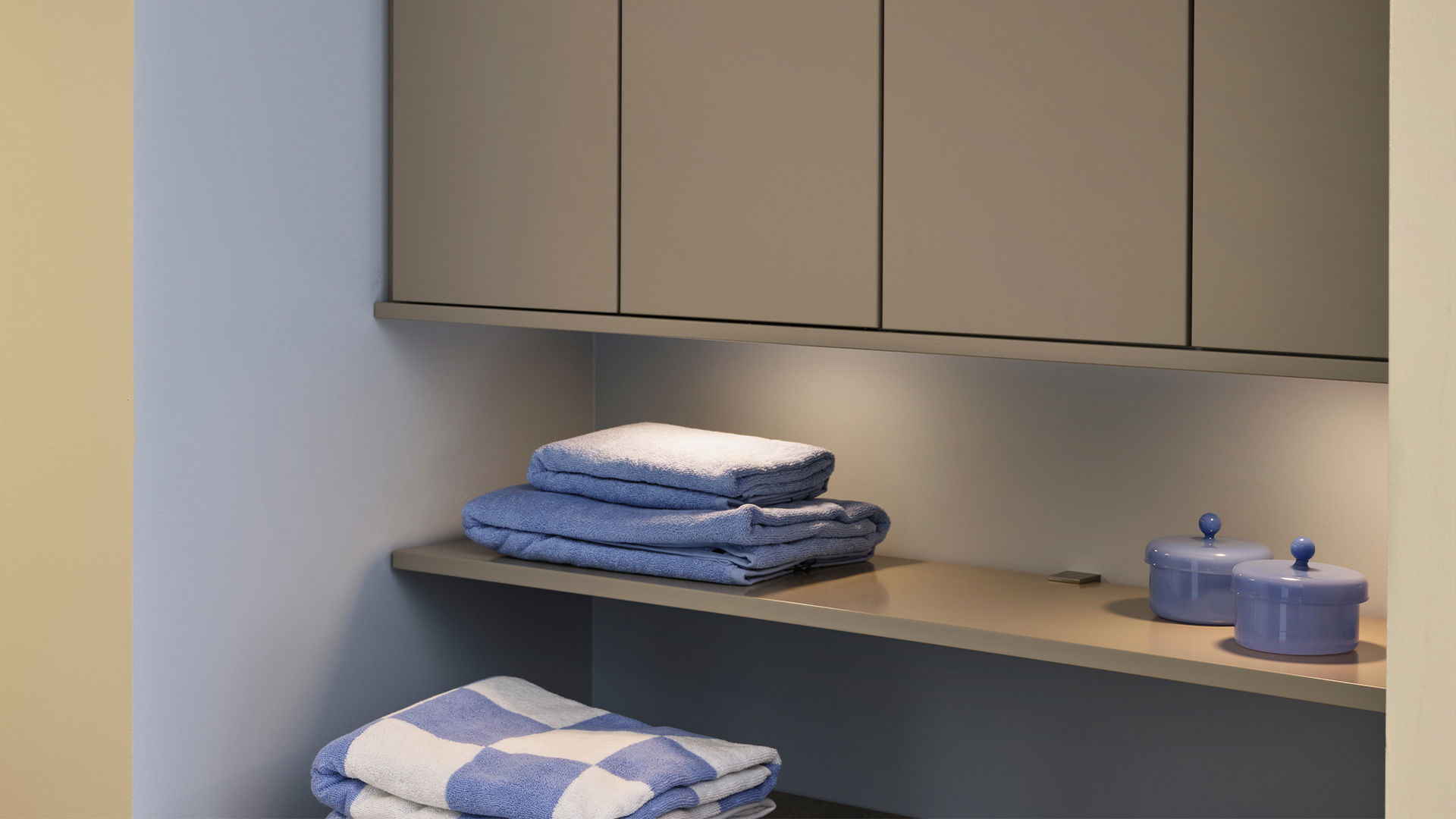 Her har vi skapt en vakker og innbydende kombinasjon der både bad og vaskerom får plass. En perfekt løsning for barnefamilier. Vaskerommet har en praktisk arbeidsflate, vegghylle og overskap som gir god oppbevaring på liten plass – og døren Maja binder alt sammen i en lys og rolig helhet. Solgule vegger, lyseblå nisje og Terazzo-gulv gir en sommerlig følelse.