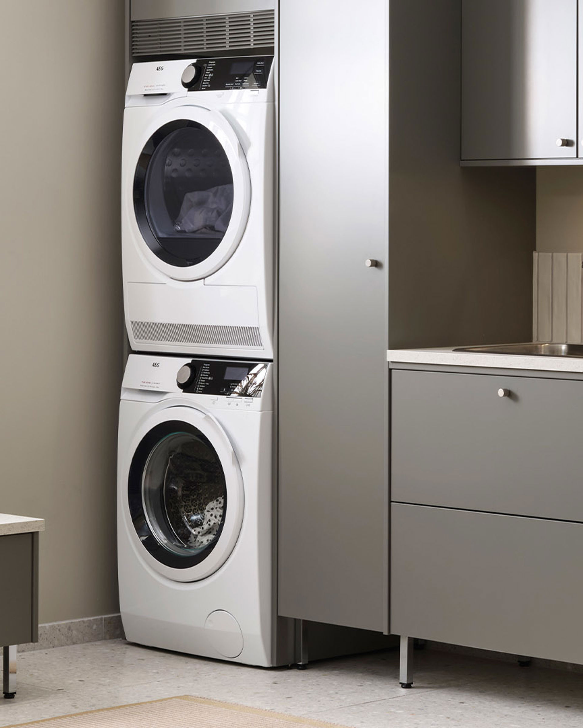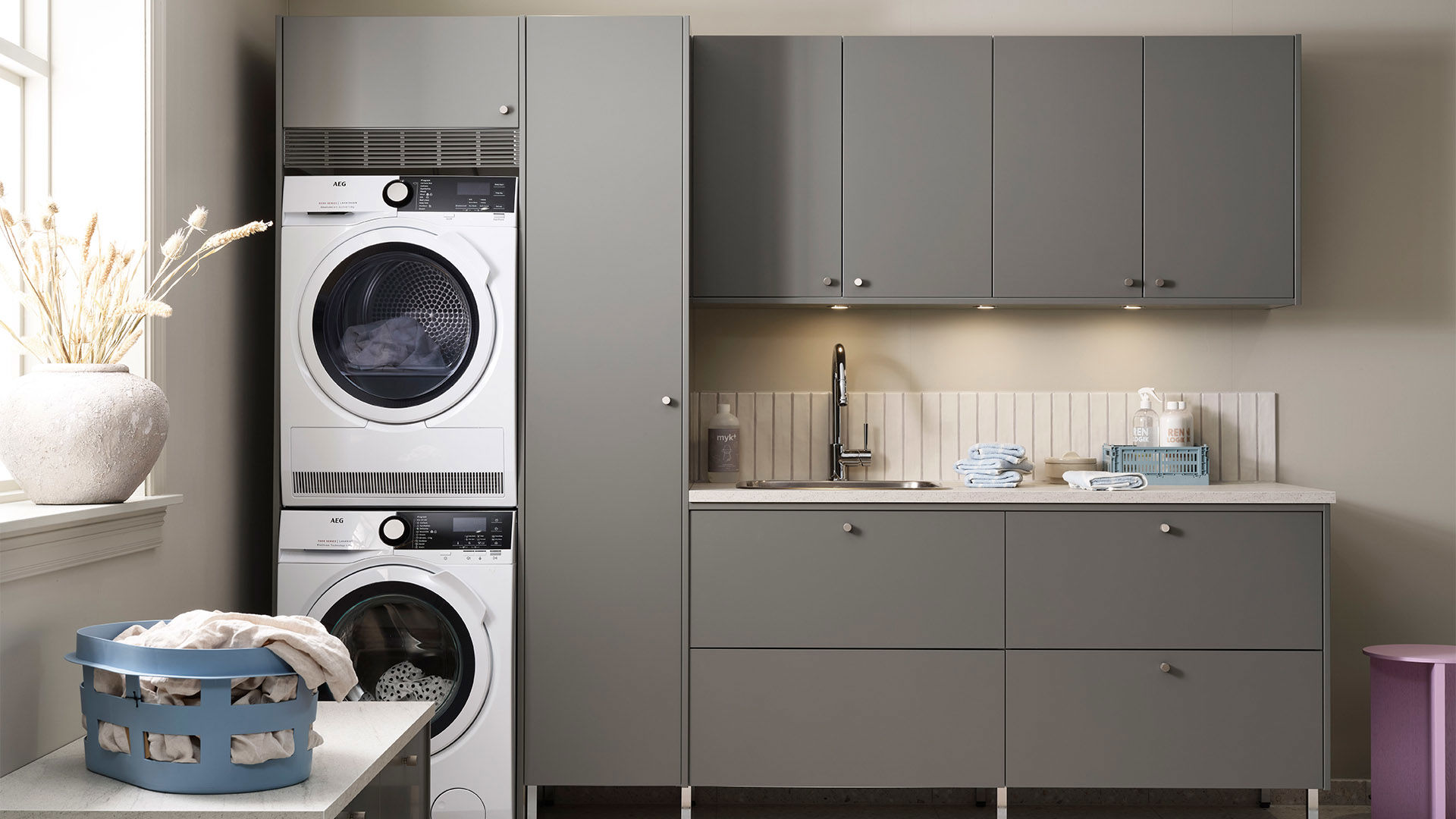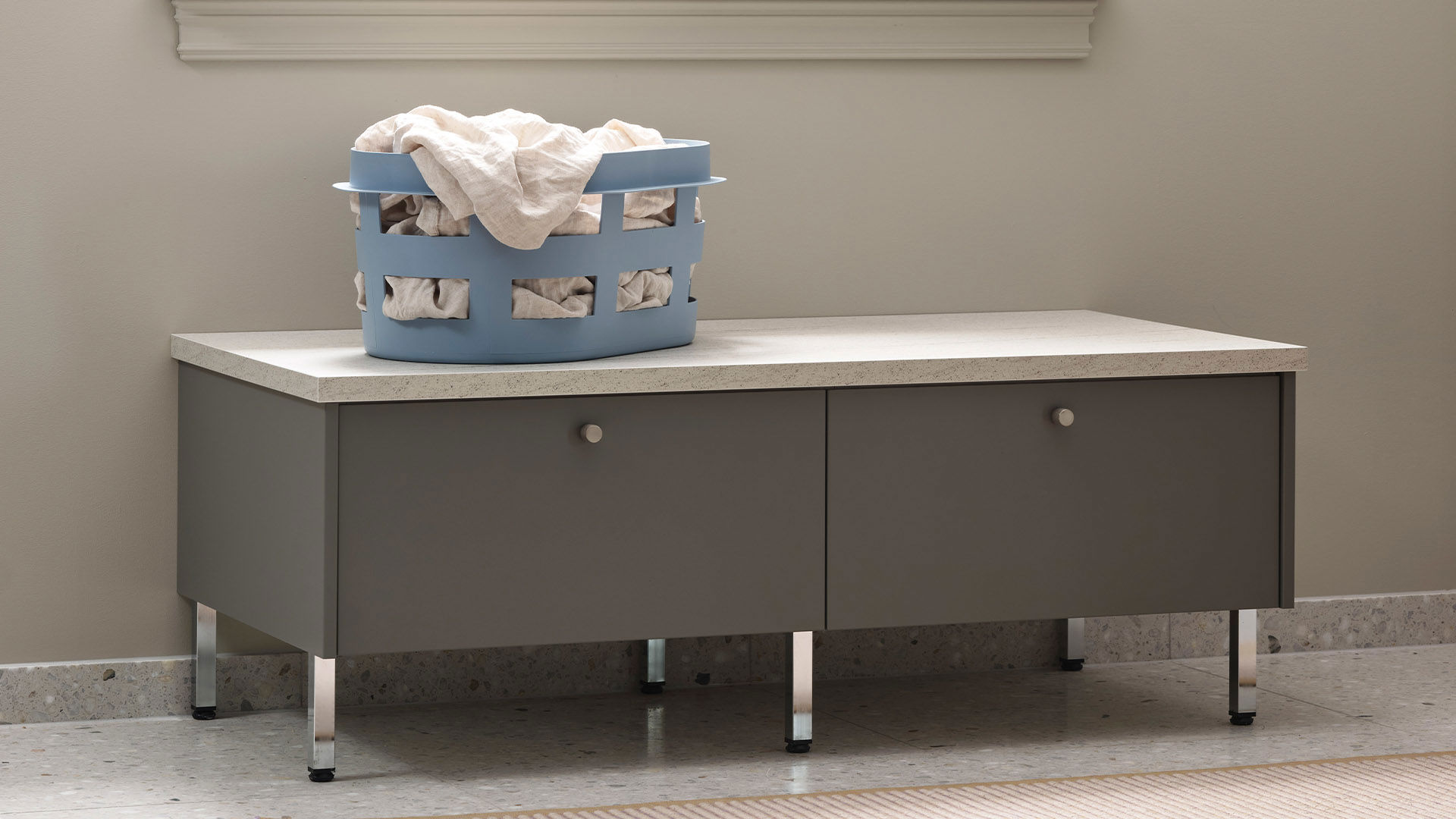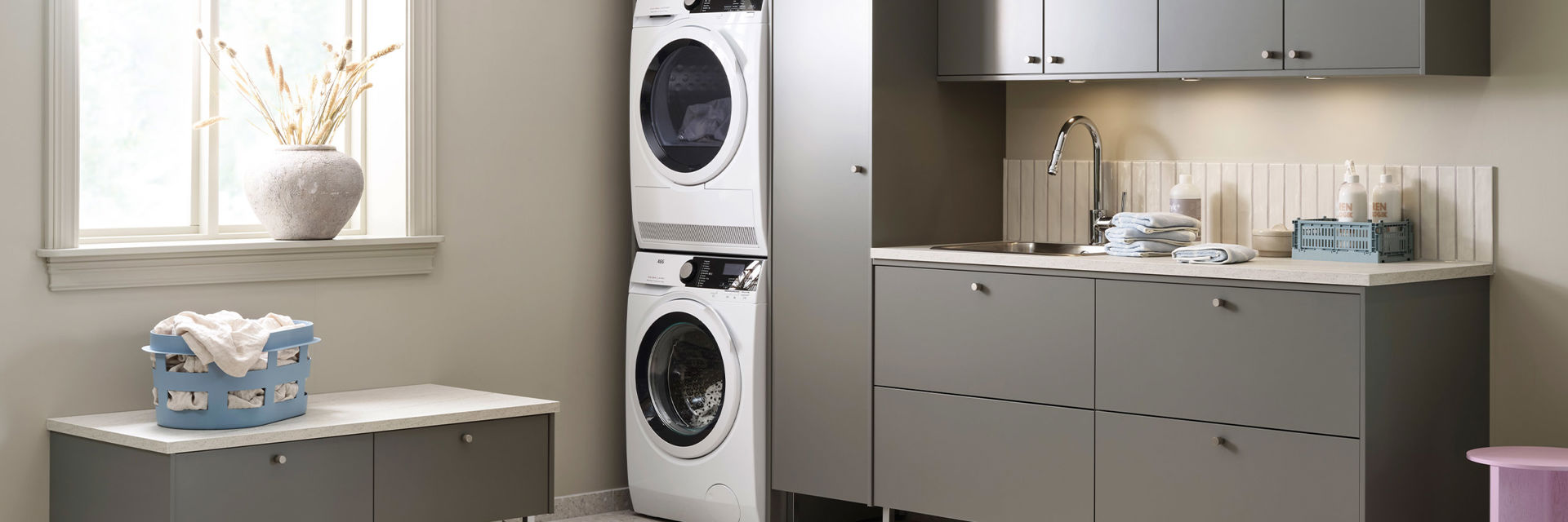 Et lyst og innbydende vaskerom med døren Maja i betonggrå. Moderne og stilrent i både funksjon og uttrykk med vår nye benkeplate i laminat, fliser som sprutbeskyttelse, rikelig med oppbevaring og praktisk benk/avlastningsflate. Her ønsker alle å hjelpe til med klesvasken!