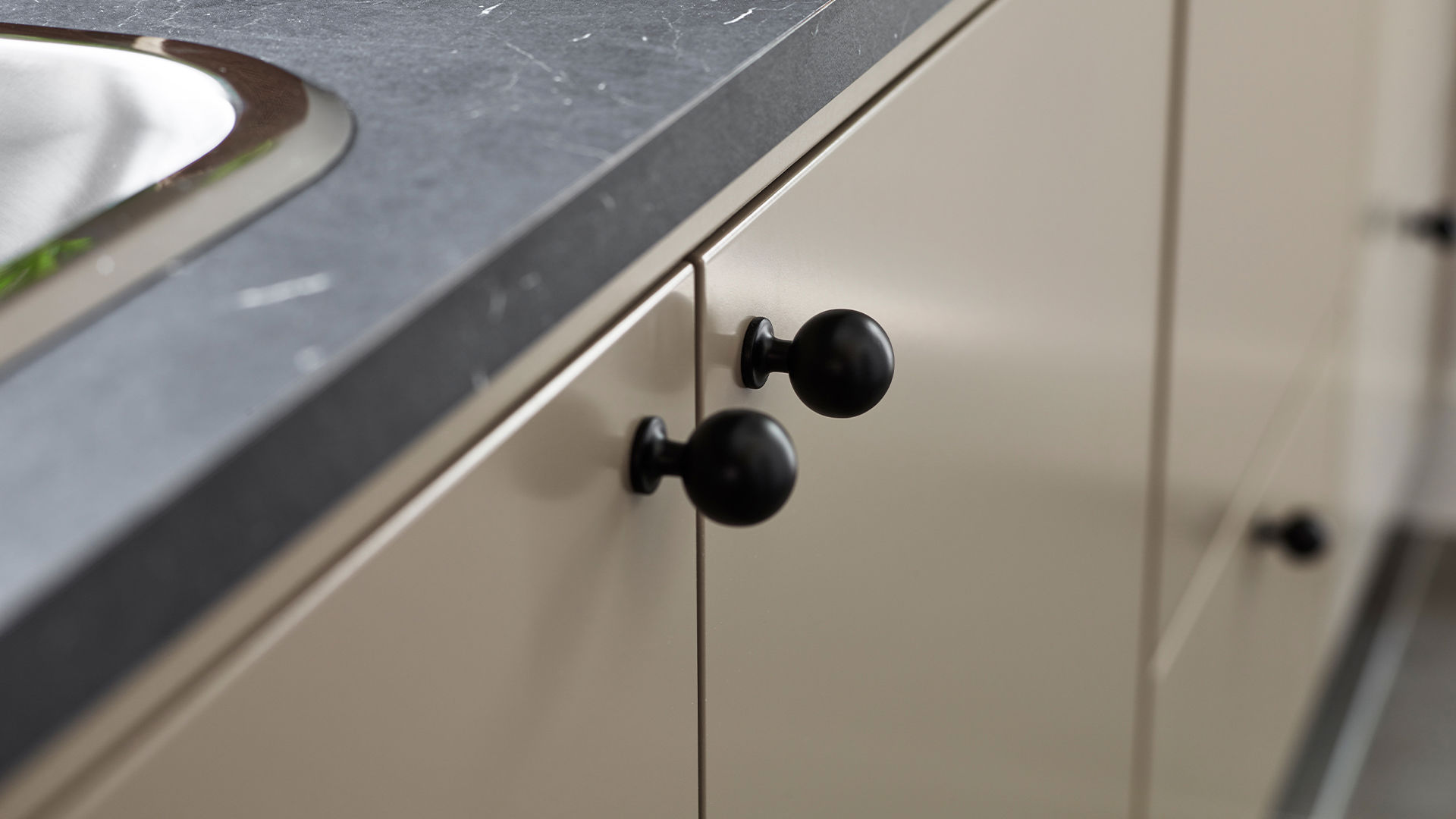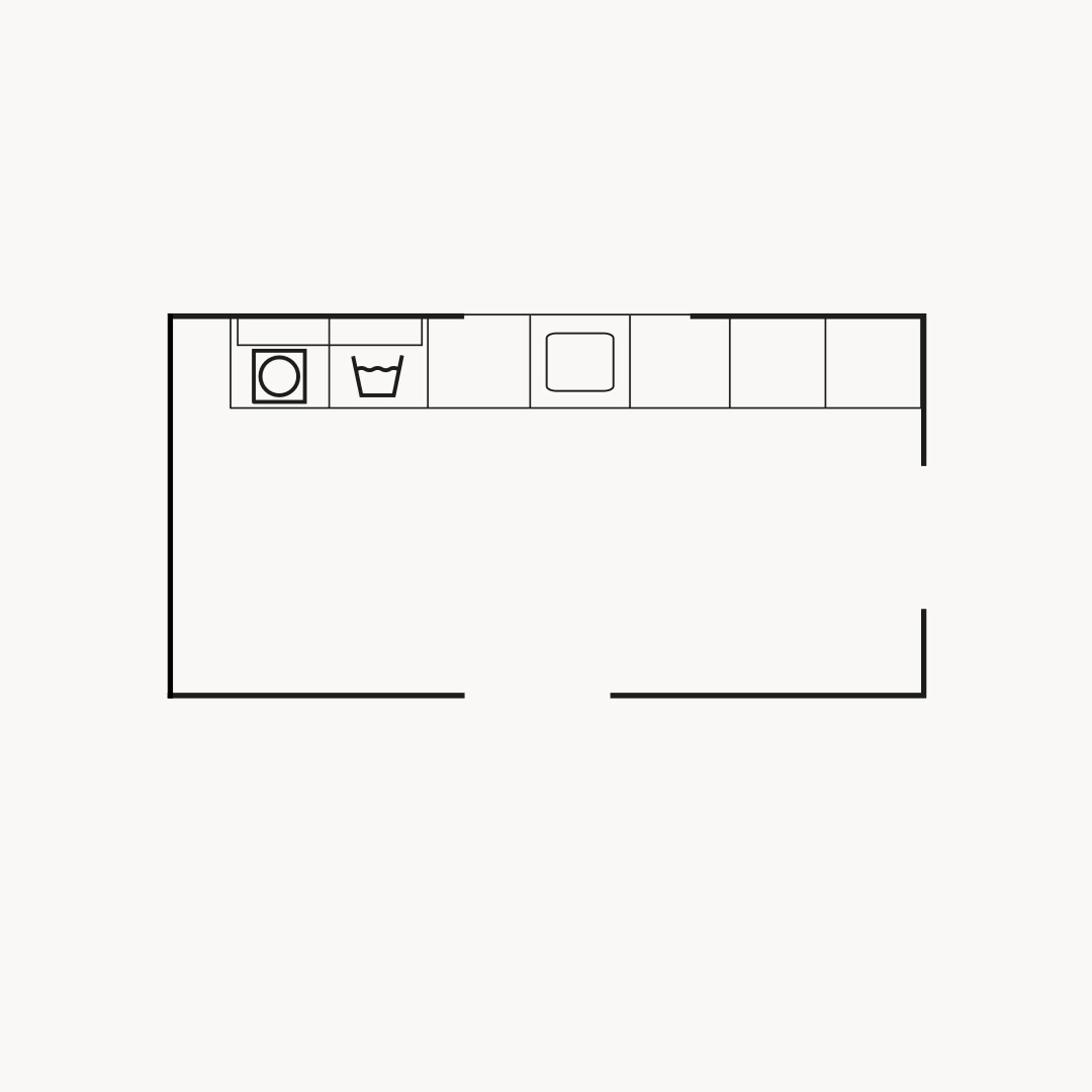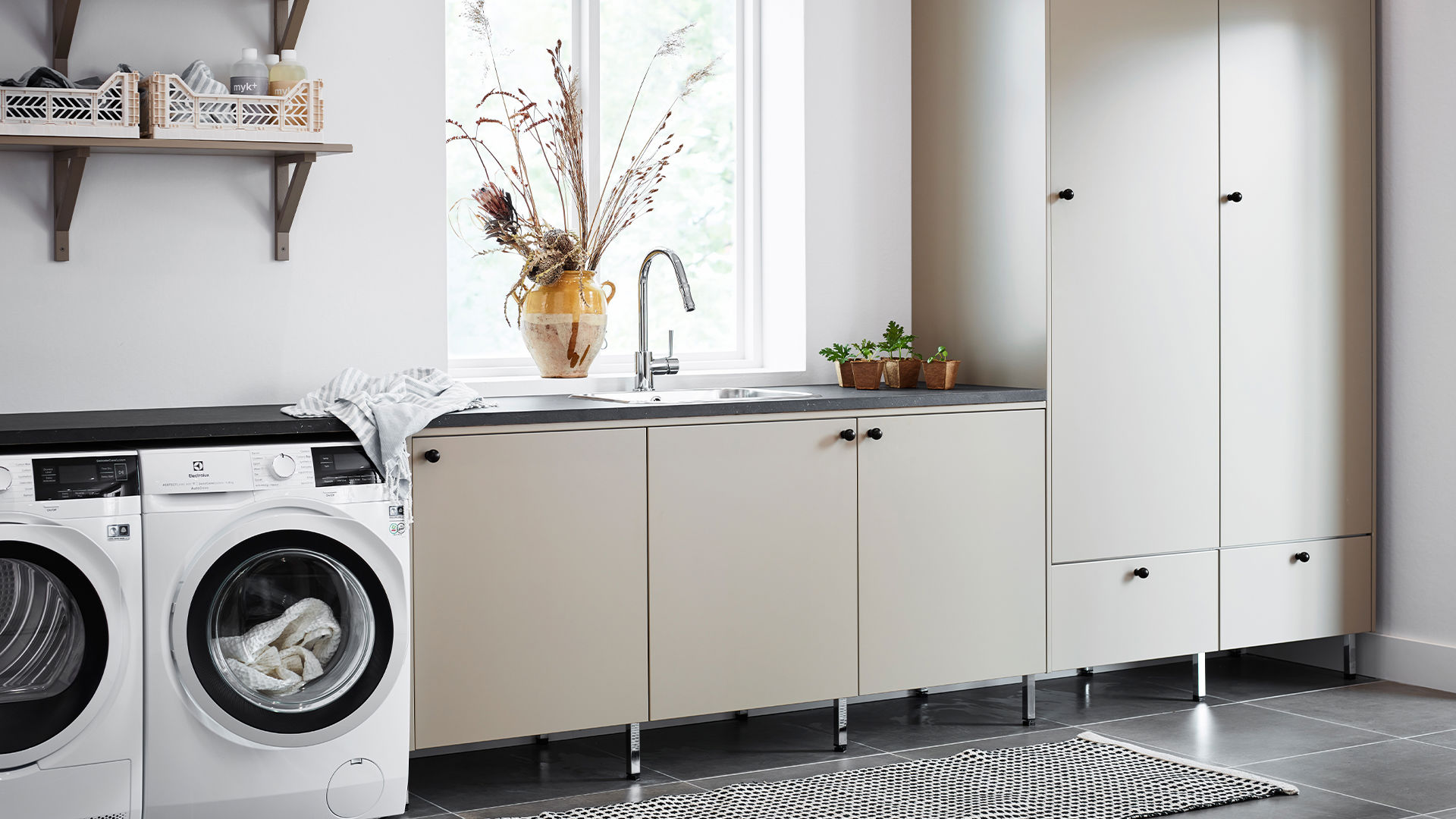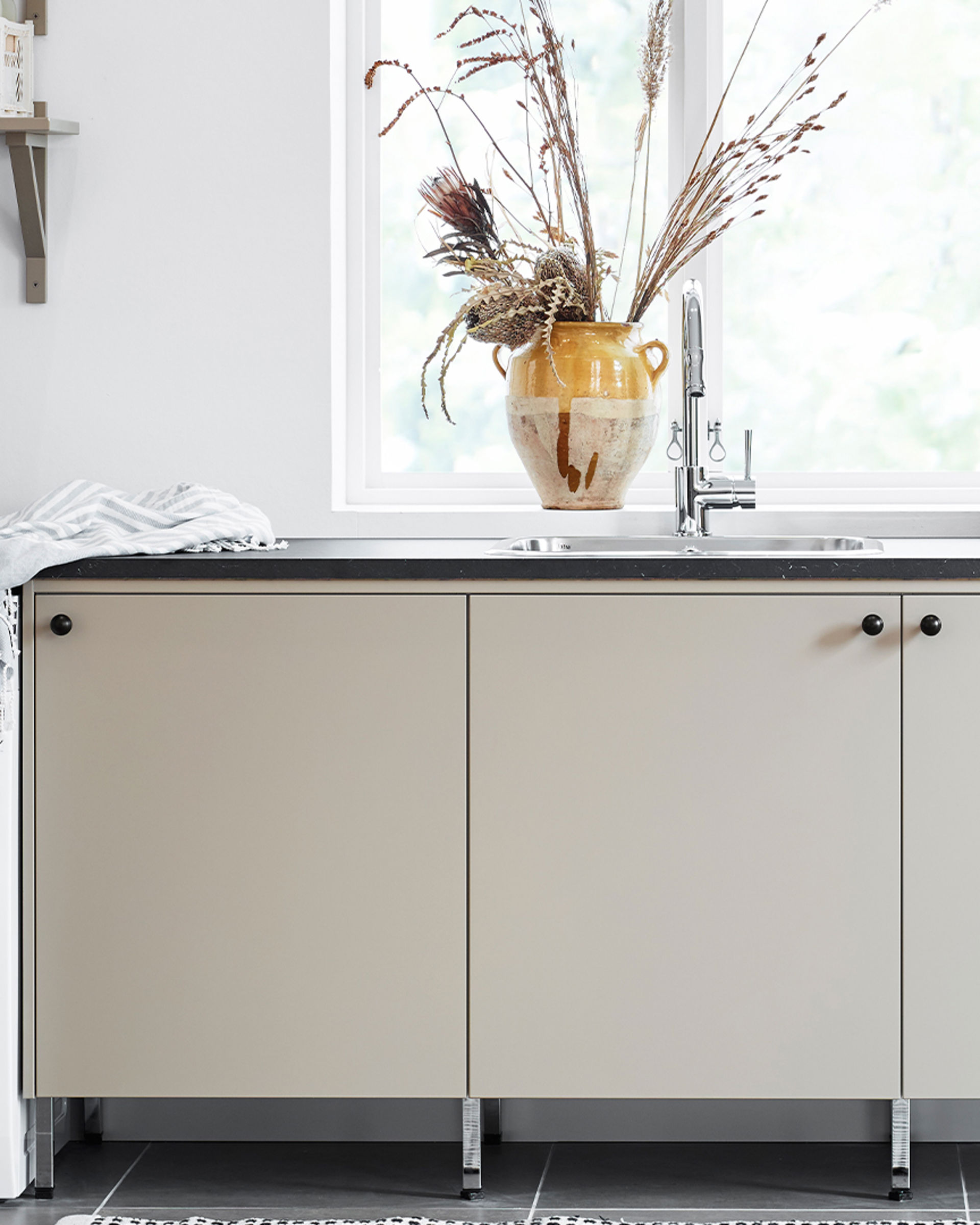 I dette vaskerommet har vi brukt fronten Maja og skapt en funksjonell løsning. Åpne hyller for å få enkel tilgang til det du bruker ofte, og skap for å skjule andre ting. Svarte detaljer som håndtak og benkeplate skaper et tydelig uttrykk.