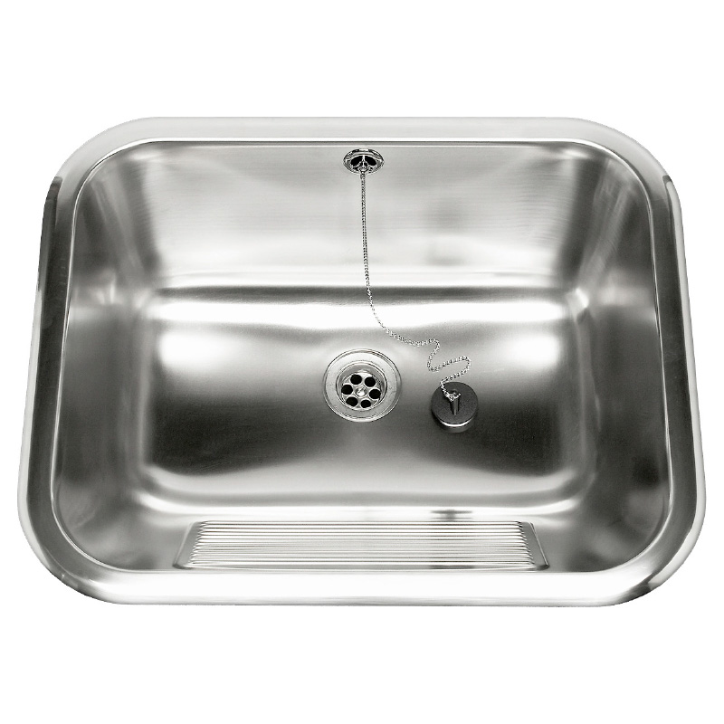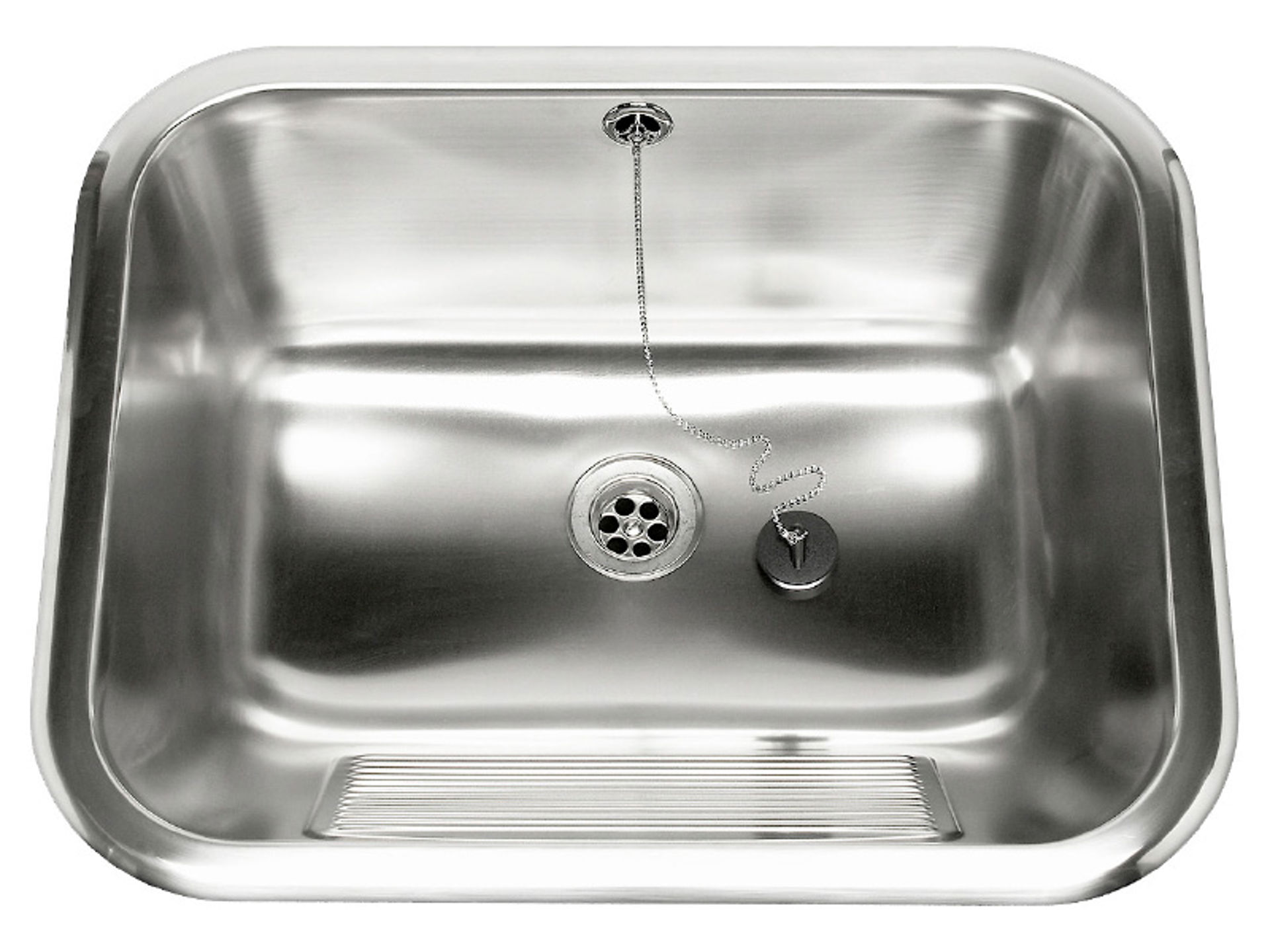 Tvättho med räfflad frontpanel, rostfritt stål för nedfällning i bänkskiva. Levereras med fästen och spännare, ventil med propp och kedja samt bräddavlopp och vattenlås.