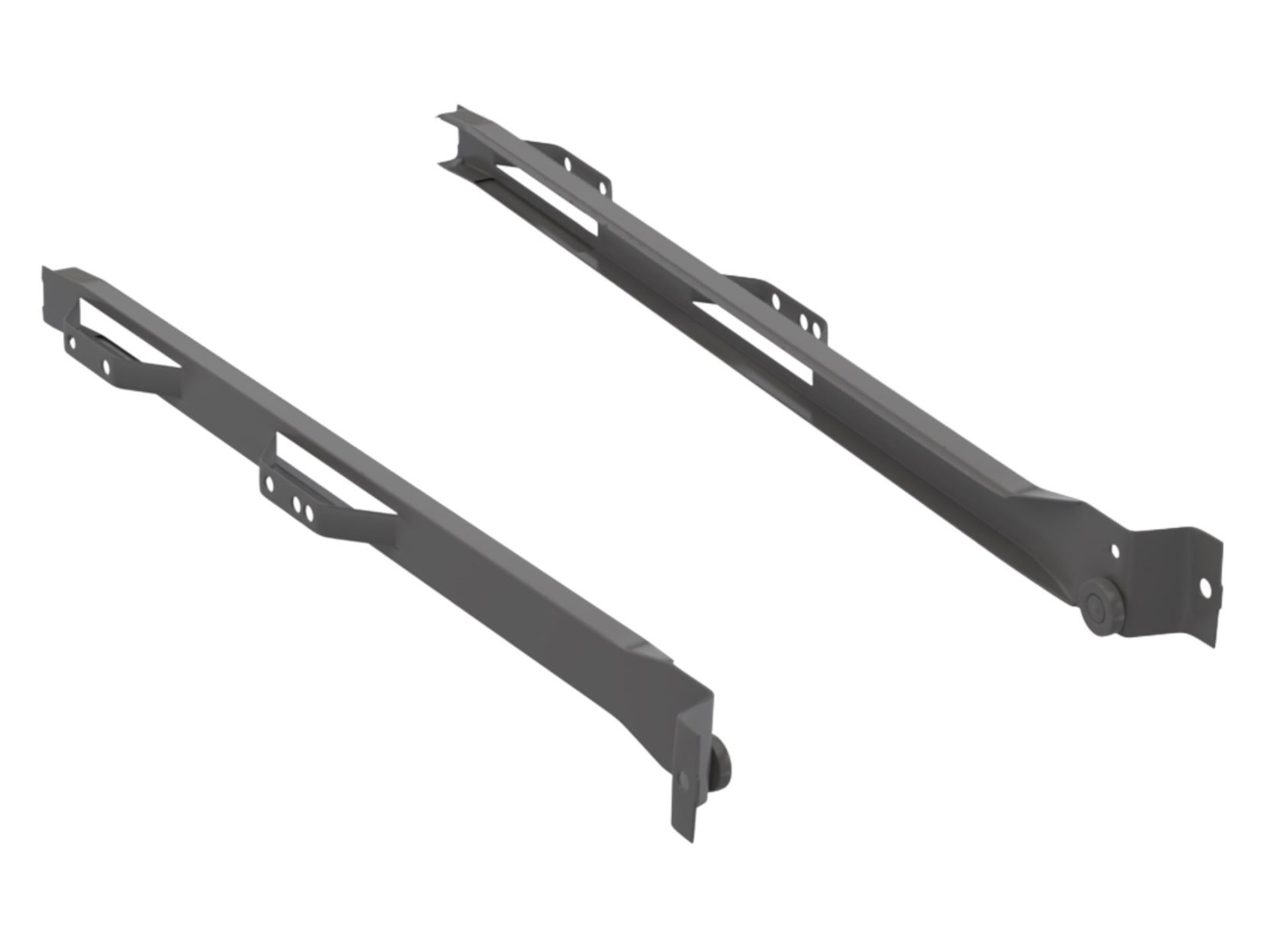 Rullskena i höger- och vänsterutförande, ingår som standard i skåp med trådhyllor och trådbackar. Lösa tillbehör som Byxhängare och skohylla kompletteras med rullskenor som monteras i stommen med systemskruv, artikelnummer 39101 två st./skena.