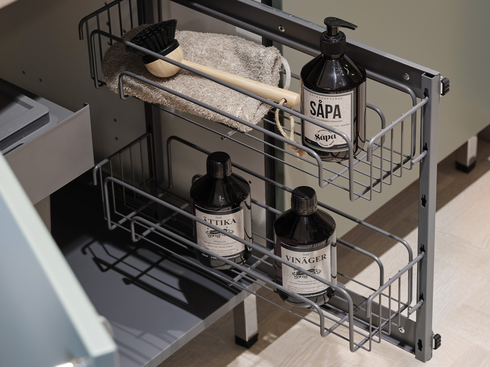 Sidohängt utdrag med två trådhyllor.