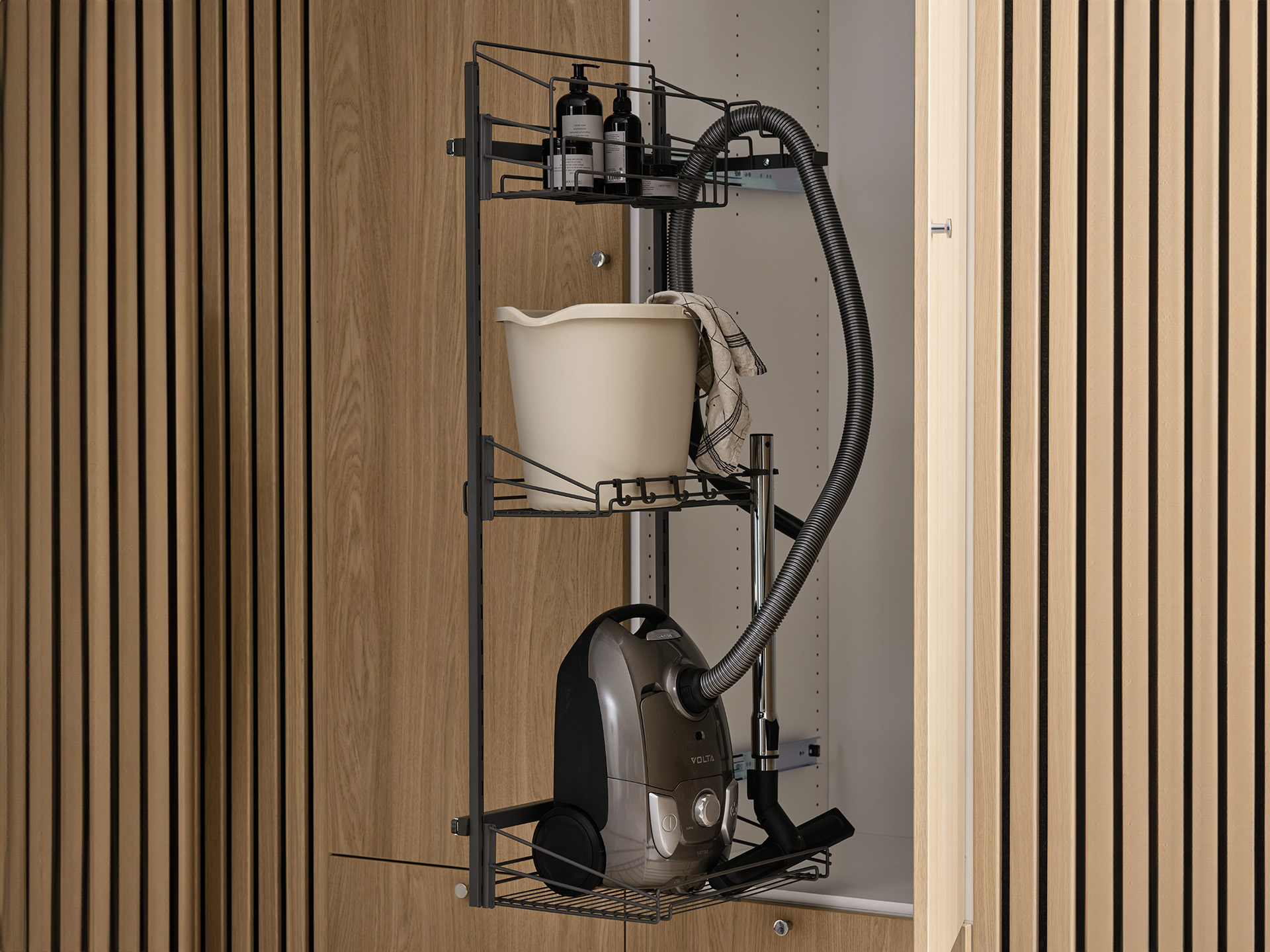 Städskåpsutdrag metall för praktisk förvaring av dammsugare och städtillbehör. Utdraget består av tre flyttbara korgar och är vändbart för montering på valfri sida. Krokar för fri placering. Klämma för dammsugarens rör gör att man kan förvara dammsugaren ihopsatt.