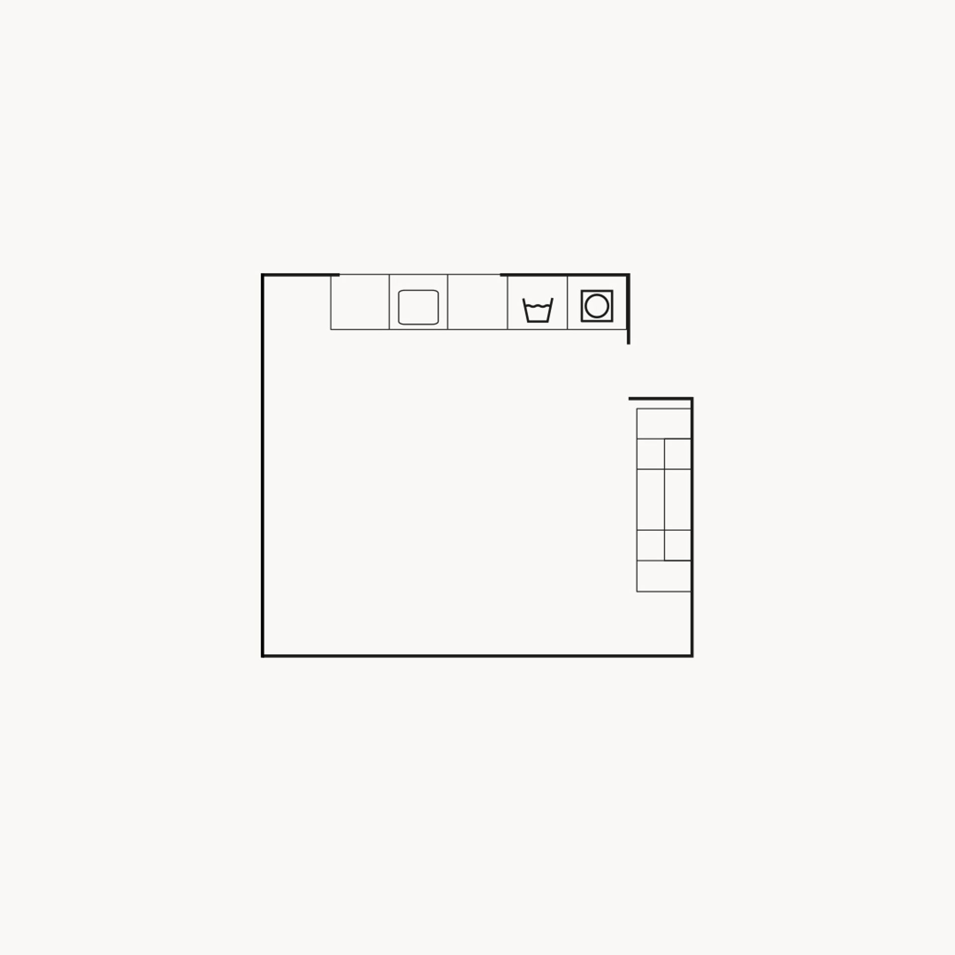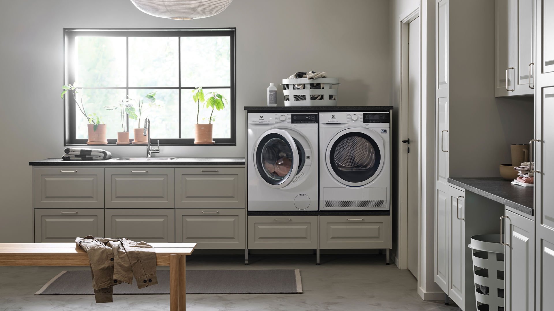 I dette vaskerommet er det trivelig å være. Med den klassiske døren Alice i varmgrått har vi skapt et koselig rom med plass til vask og annen klespleie, men vi har også valgt å integrere en skrivebordsplass. Kanskje for hjemmearbeid, en symaskin – eller du får selskap av barn som gjør lekser mens du tar hånd om klesvasken.