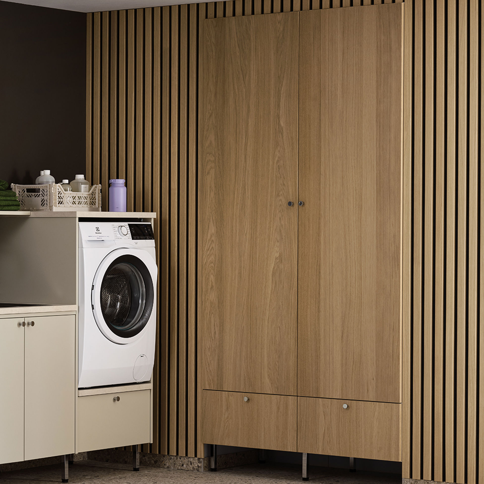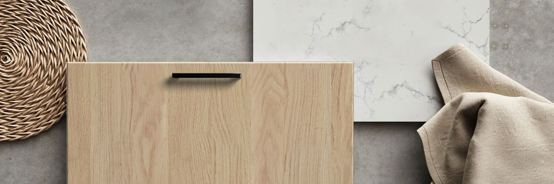 Eikefinerte dører i 20 mm sponplate med lett avrundet trekant. Stående finér på skuffefronter og dører. Døren er Svanemerket.